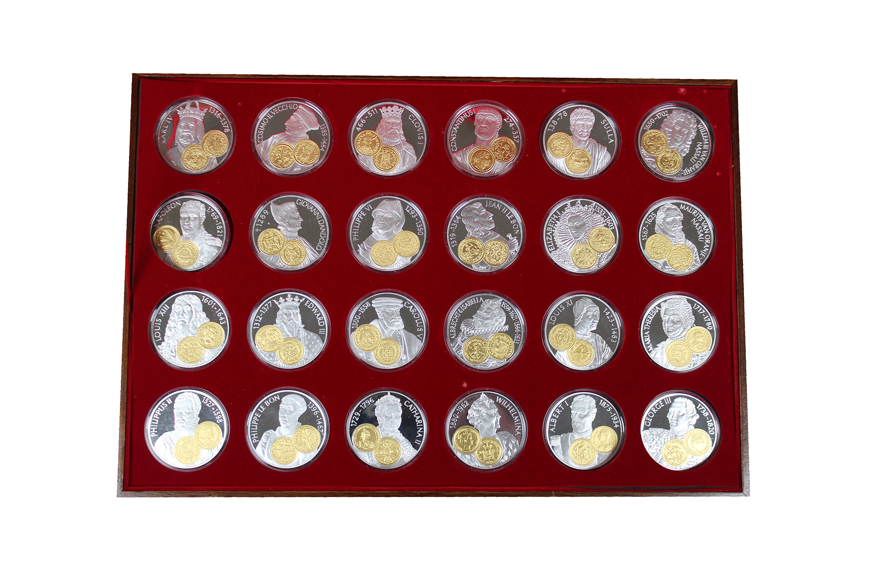 Lot (24) 10 Gulden 2001 handelsmunten van West-Europa uit de afgelopen twintig eeuwen. Complete serie van alle 24 verschillende 10 gulden handelsmunten in cassette. AR 925/1000 - 31,1 gram met gouden inlay van 0,62 gram.
