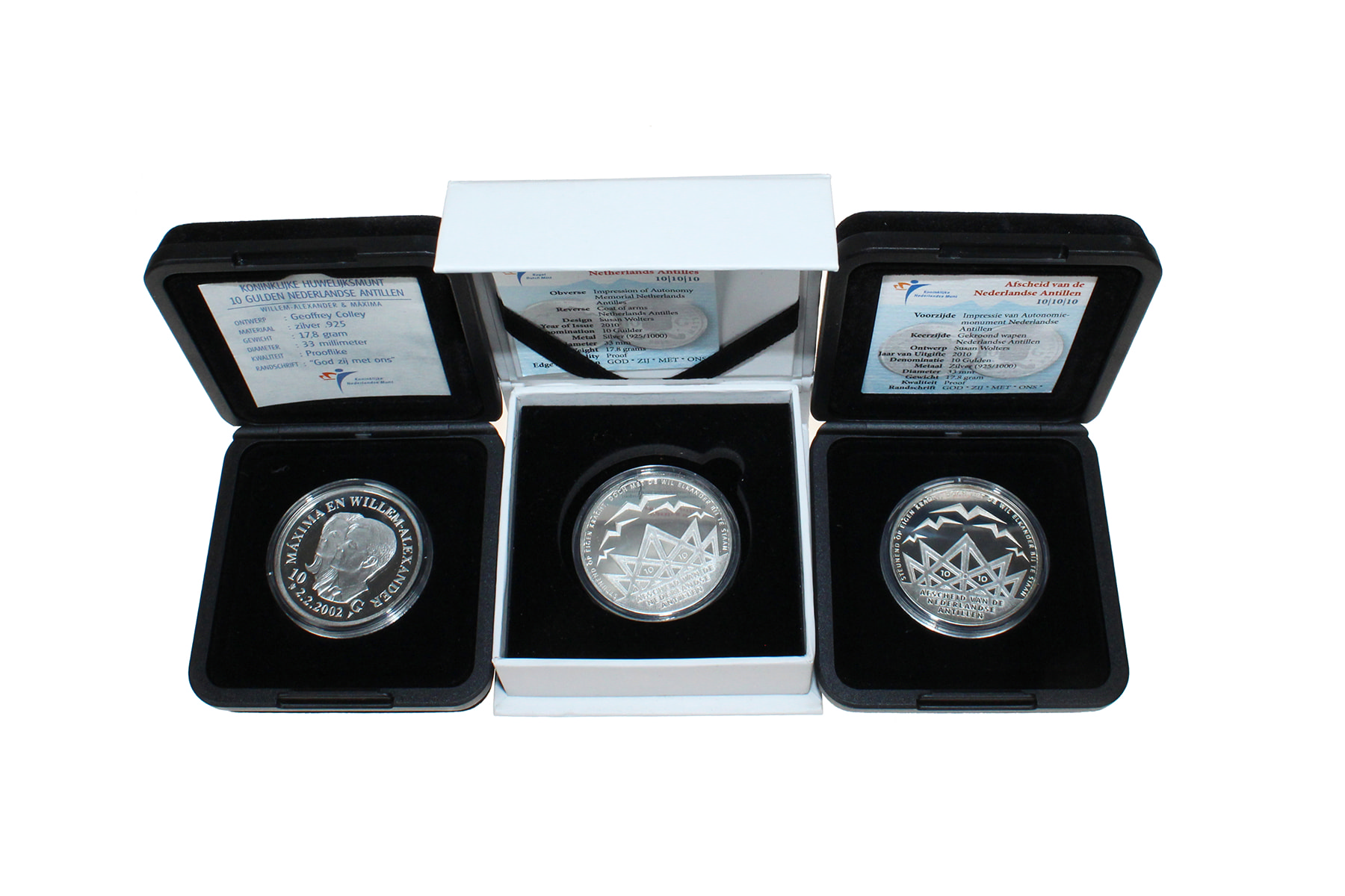 Lot (3) 10 Gulden 2002 - Huwelijk Máxima en Willem-Alexander; 2010 - Afscheid Nederlandse Antillen (2). Proof.