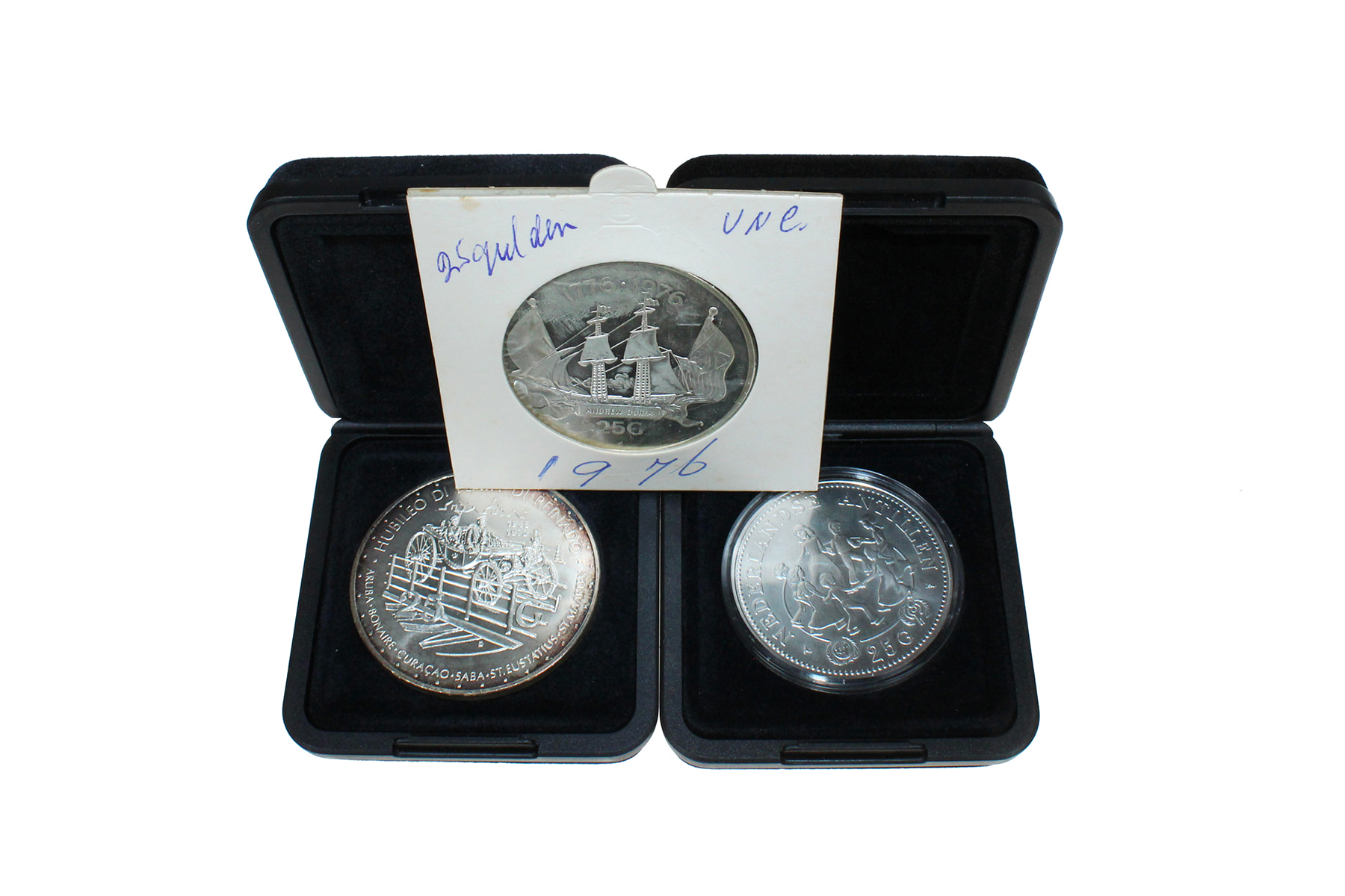 Lot (3) 25 Gulden 1973 - Postkoets; 1976 - Andrew Doria; 1979 - Spelende kinderen. Diverse kwaliteiten.