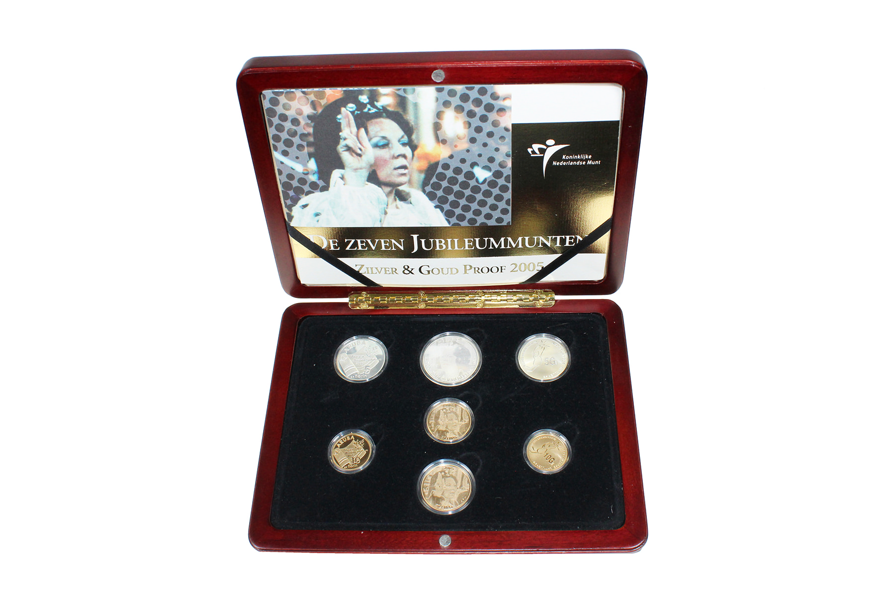 Prestigeset Jubileum 2005. De zeven jubileummunten in zilver en goud. 10 euro zilver, 20 en 50 euro goud. Aruba: 5 florin zilver; 10 florin goud. Nederlandse Antillen: 5 gulden zilver; 10 gulden goud. Oplage: 375. Proof in originele cassette, uitgegeven door KNM.