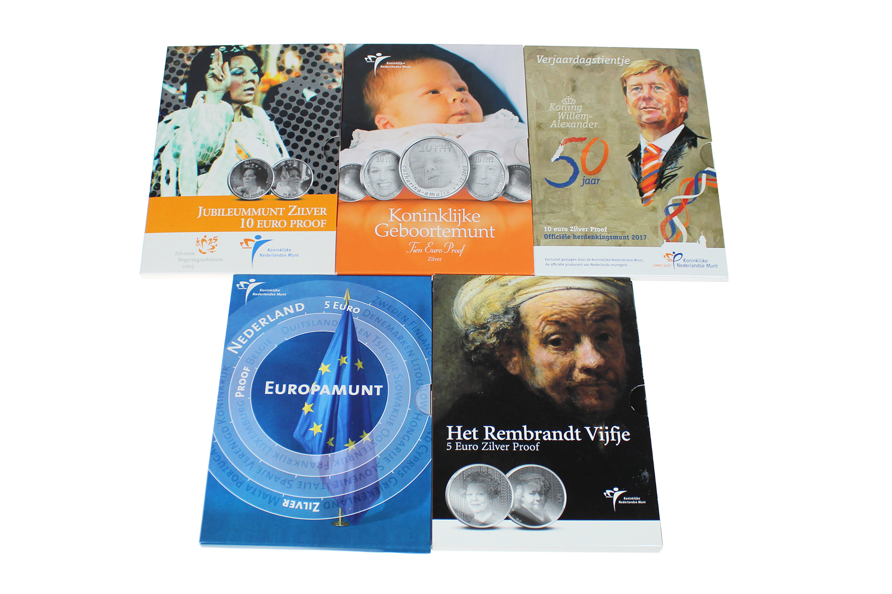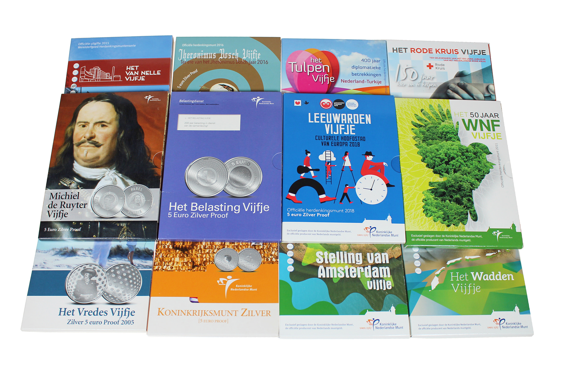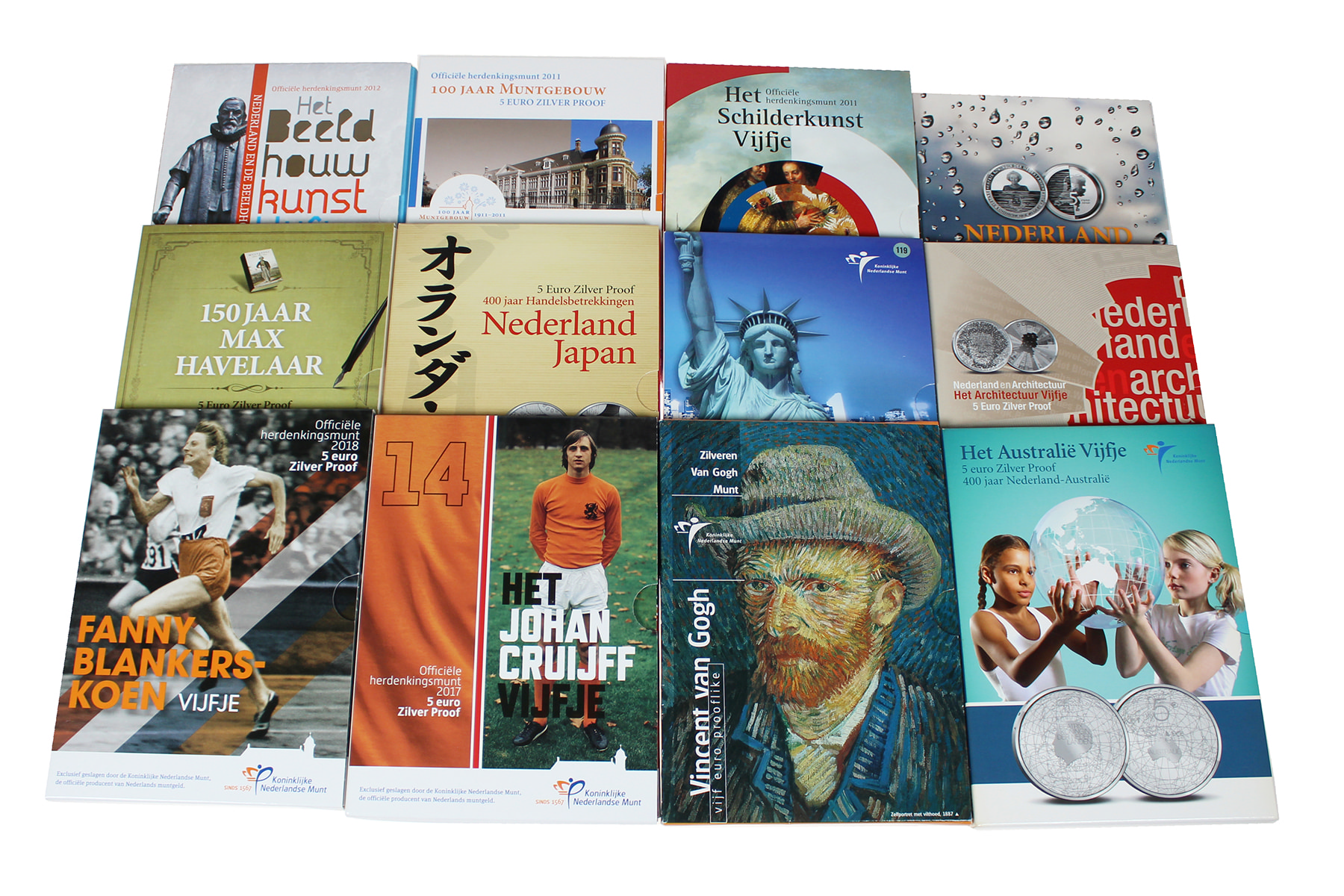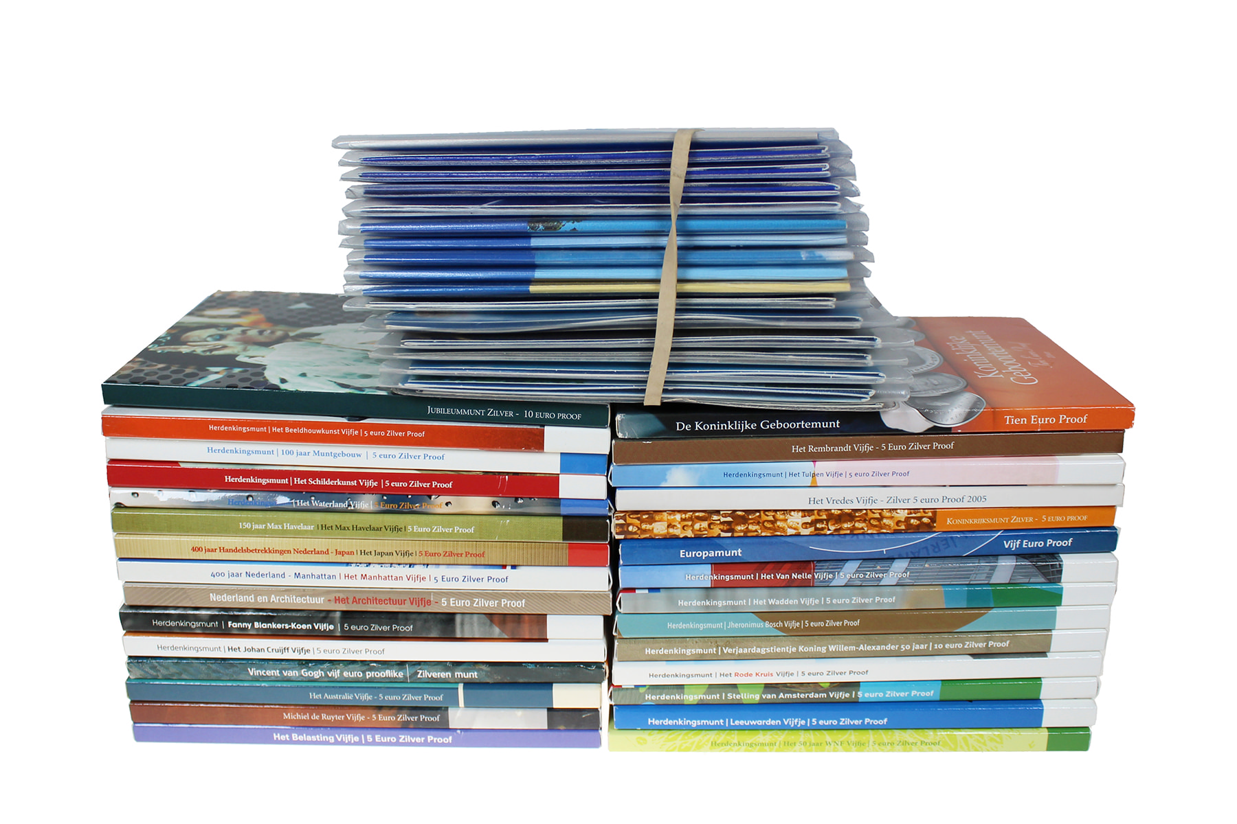 Doos met 29 themasets 5 & 10 euro waaronder Johan Cruijff vijfje. Toegevoegd 17 jaarsets.