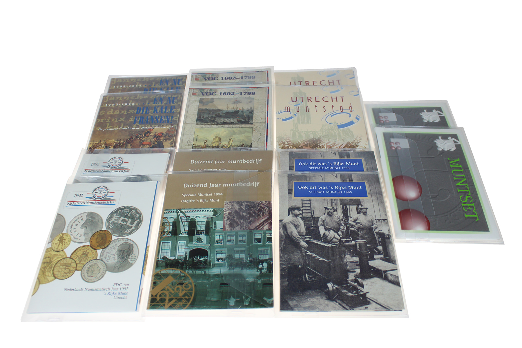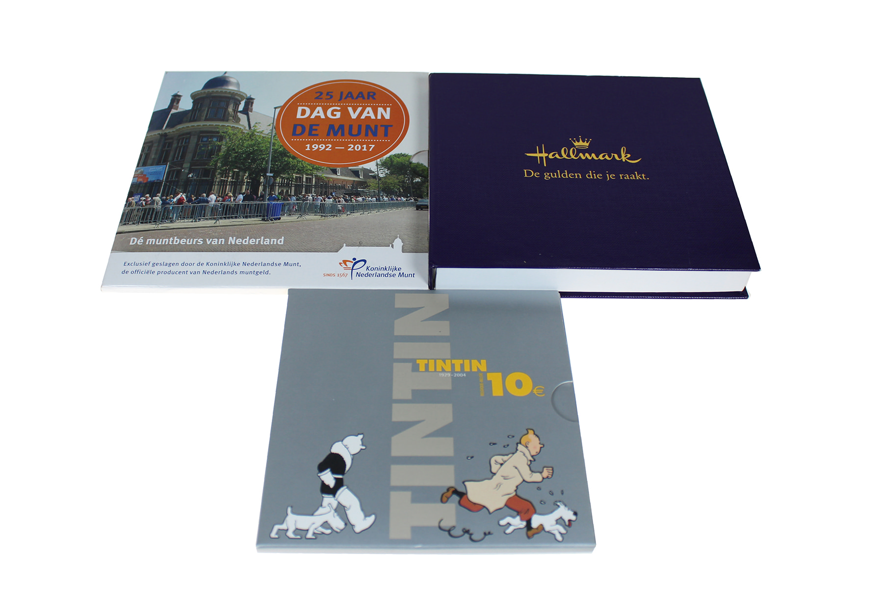 Doos met 15 themasetjes. O.a. Dag van de Munt 2017; Ehrbecker, Numismatisch jaar, Utrecht Muntstad etc. Toegevoegd: €10 België, Tin Tin 1929-2004.