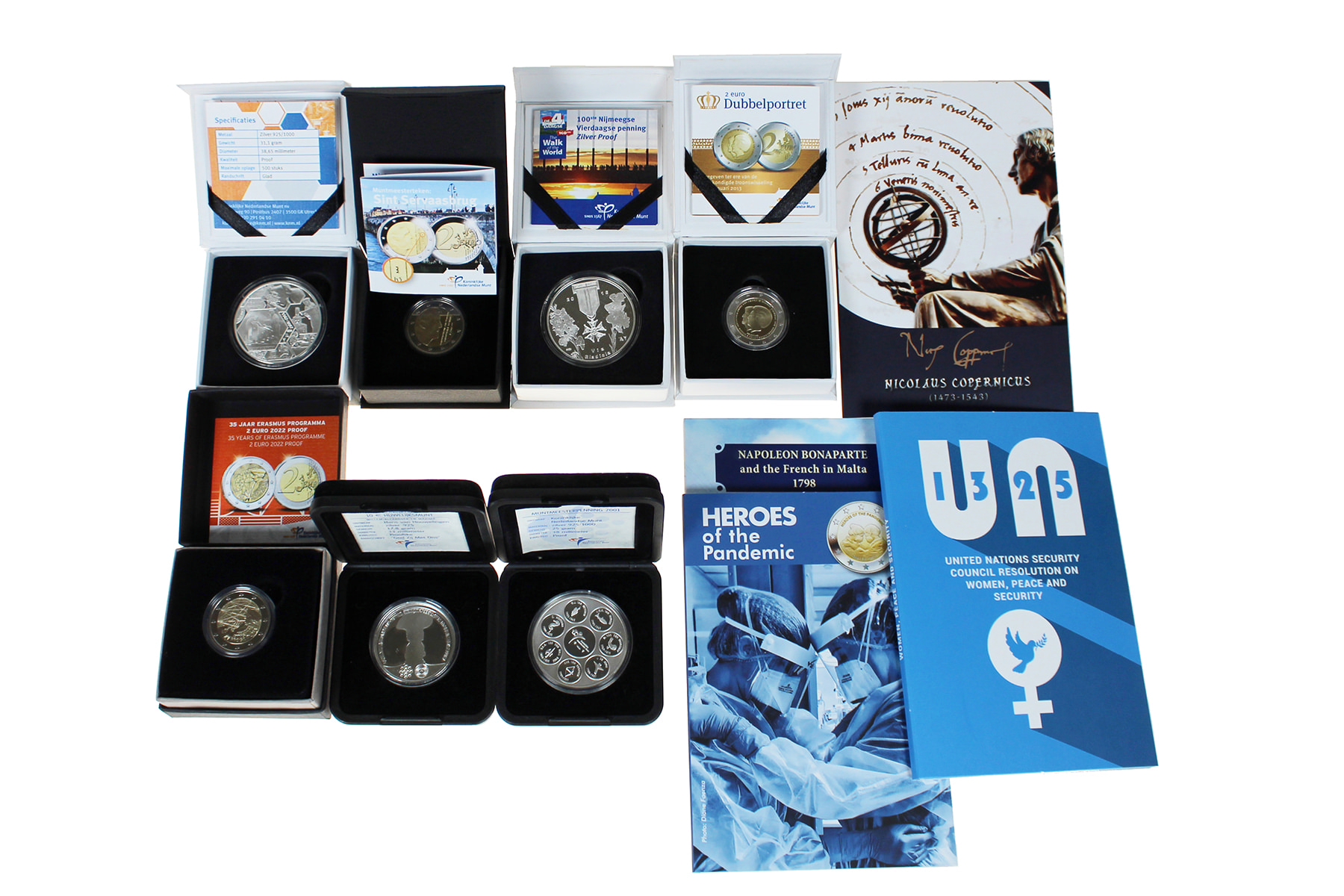 Koffer met diverse euro’s in sets en doosjes. Ook zilveren penningen.