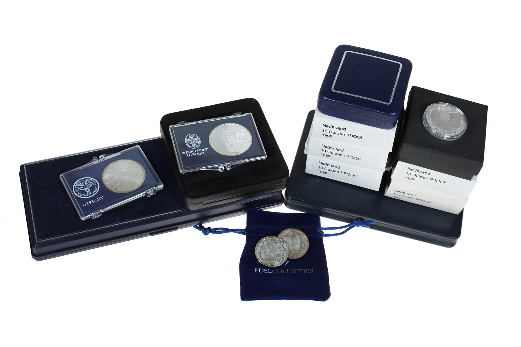 Schoenendoos met veel zilveren munten en penningen in doosjes en setjes. Ook wat euro’s. Netto zilver circa 313 gram.