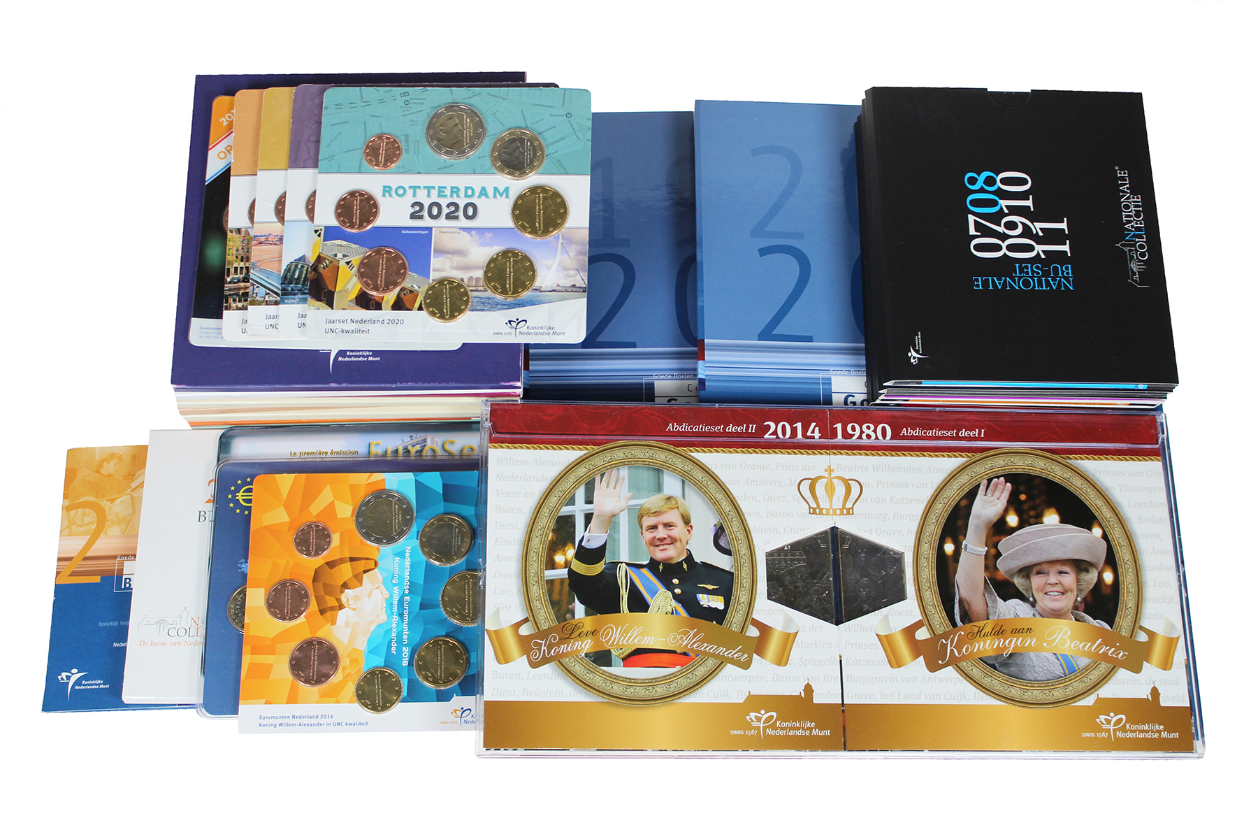 Kunststof opbergbox met ca. 35 stuks eurogerelateerde herdenkingssets, o.a. Goede Doelen etc.