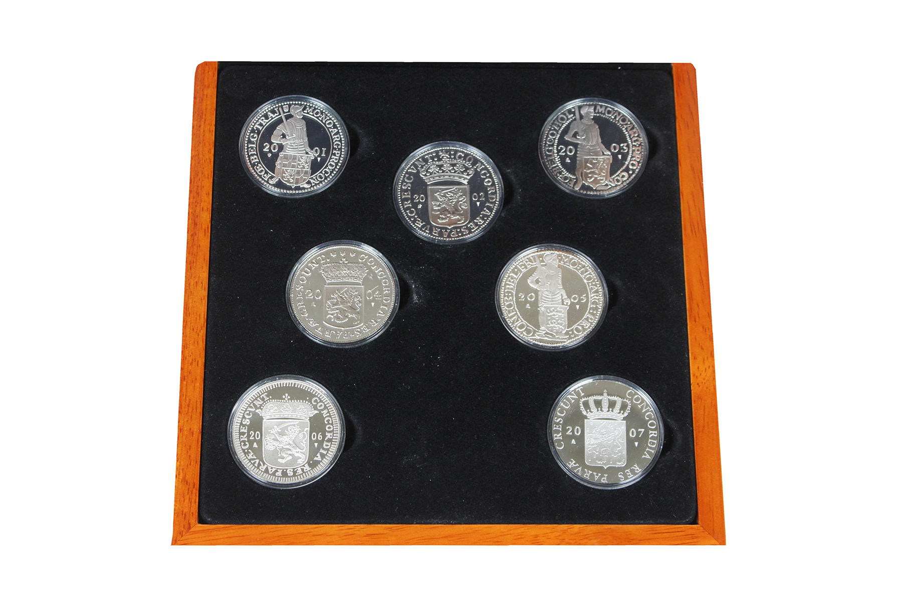 Luxe kist met serie zilveren dukaten, de zgn. Zeven Provincieën serie 2001-2007 (7 stuks). Proof.