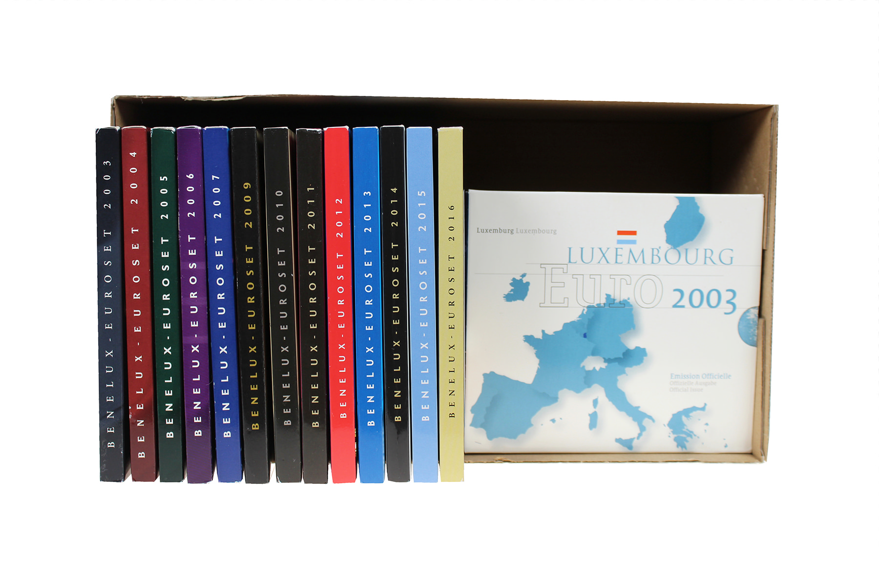 Doos met Benelux-sets periode 2003-2016. Alle verschillend.