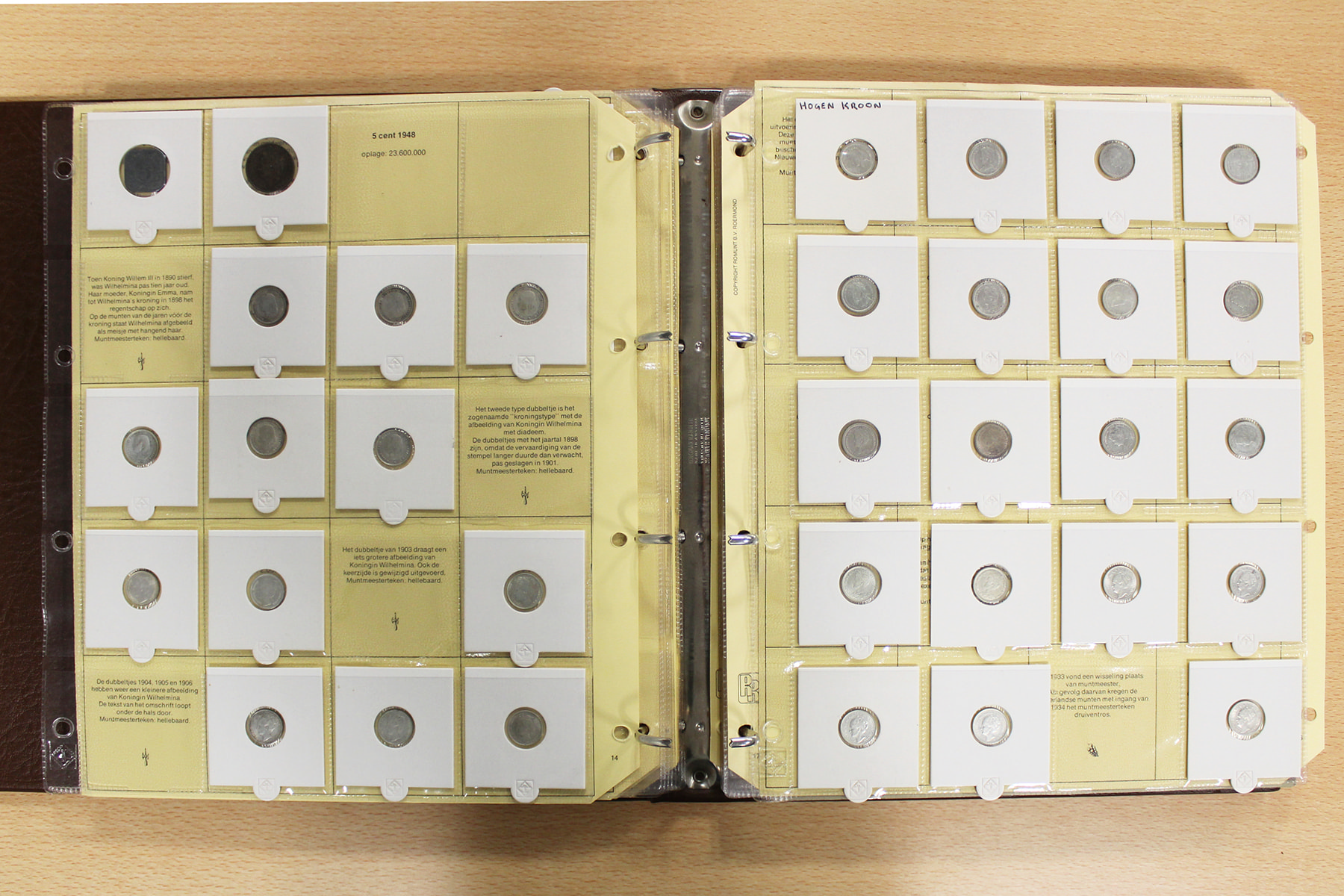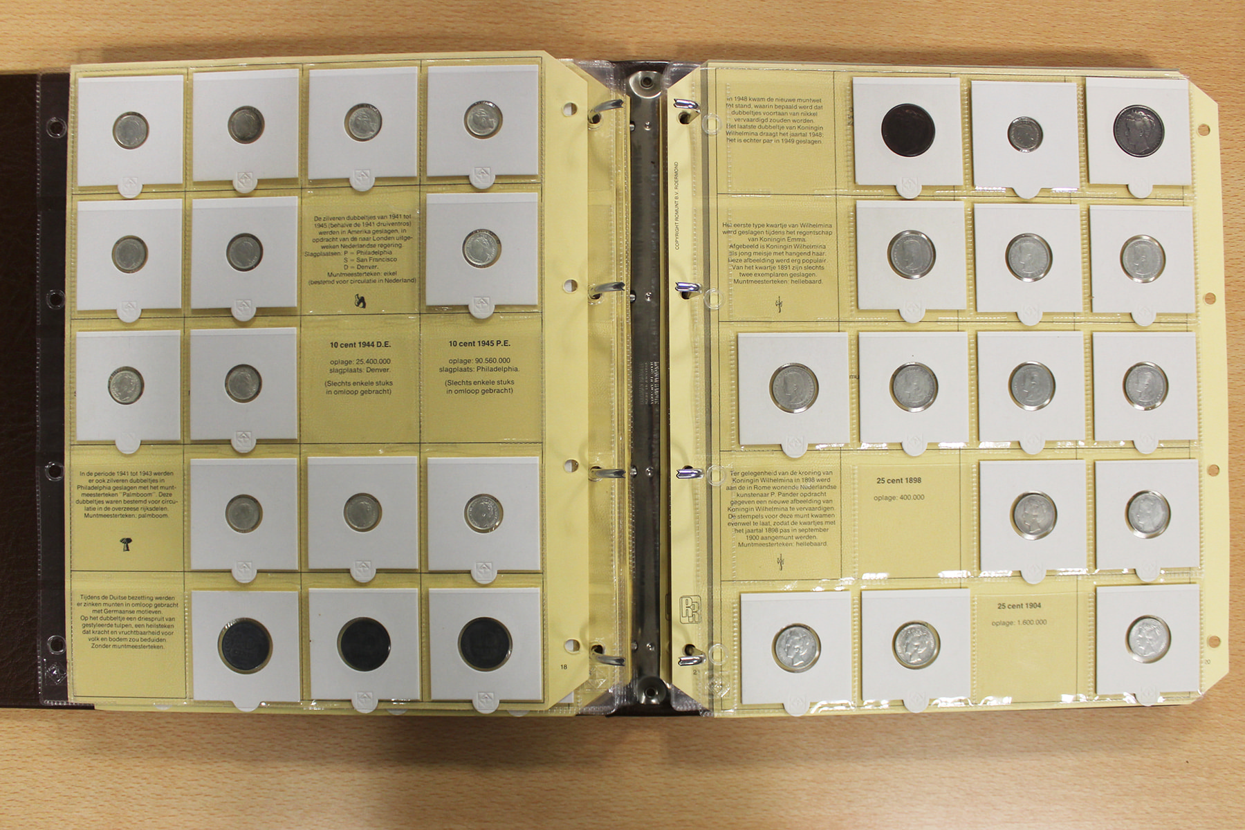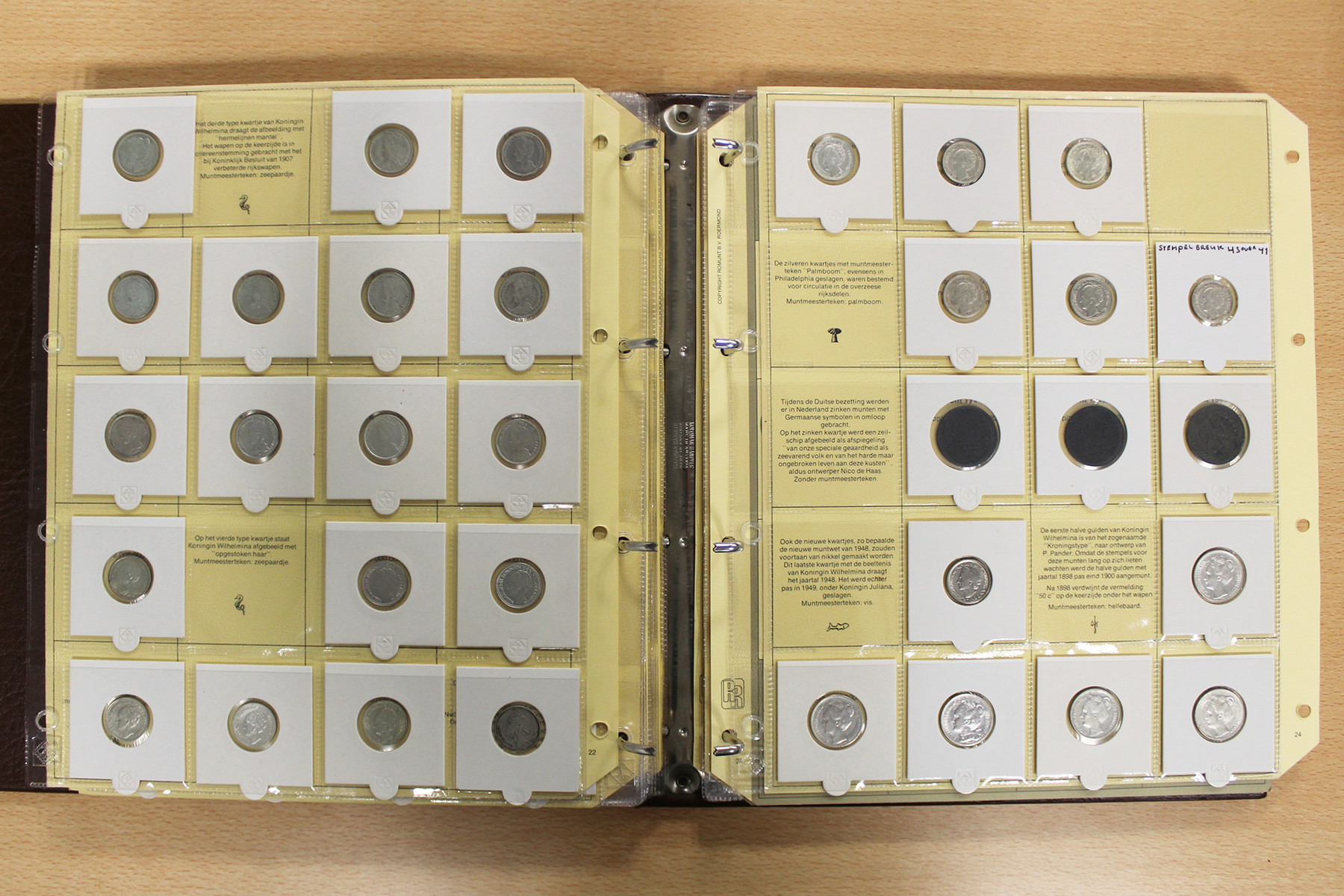 Bruin album met vrijwel complete collectie Wilhelmina 1890-1948. ½ Cent t/m 2 ½ Gulden. Aangevuld met diverse stukken, w.o. Gulden 1928 Huib Luns. Bovengemiddelde kwaliteit. Goed nazien!