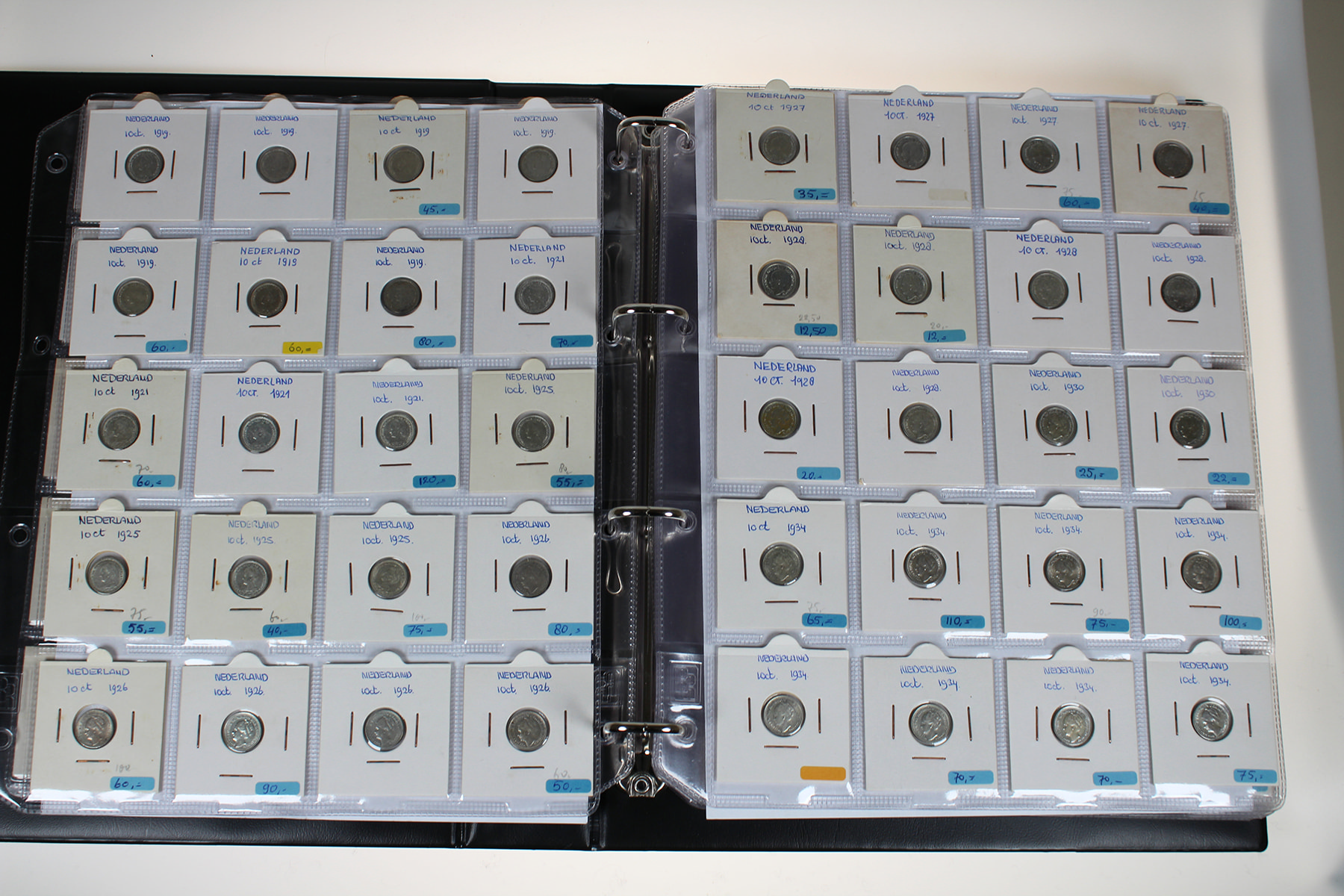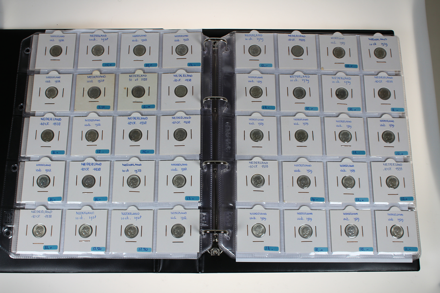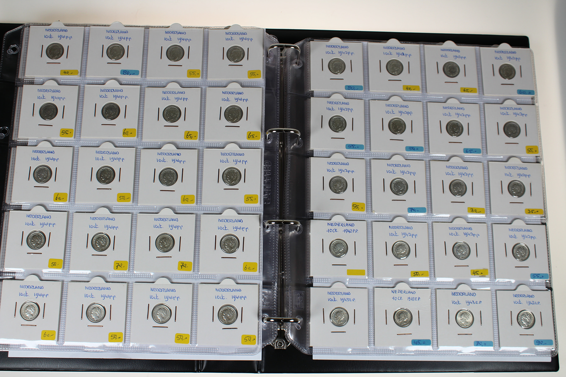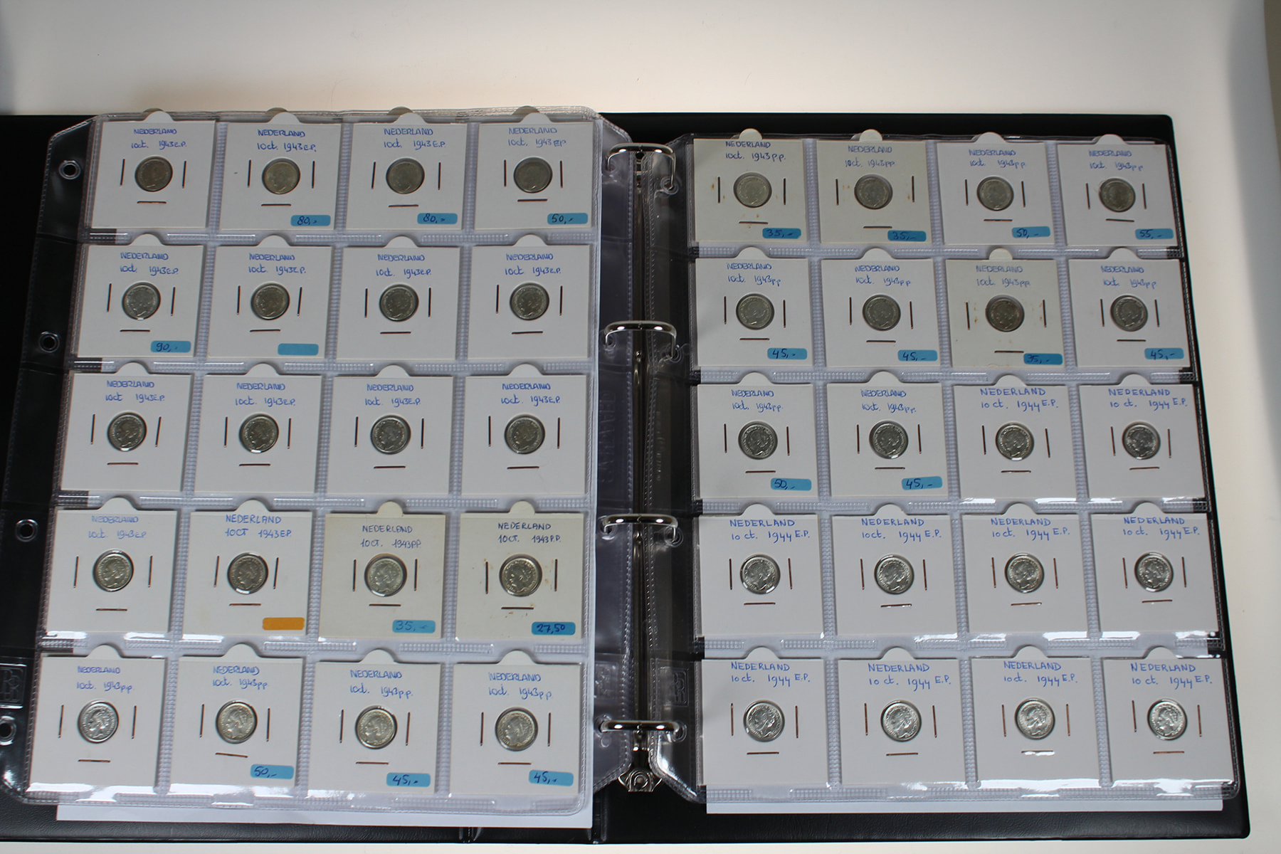 Blauw album met 300 stuks zilveren dubbeltjes Wilhelmina 1892-1944. Veel dubbeltjes tijdens WOII geslagen in de USA. In topkwaliteit!
