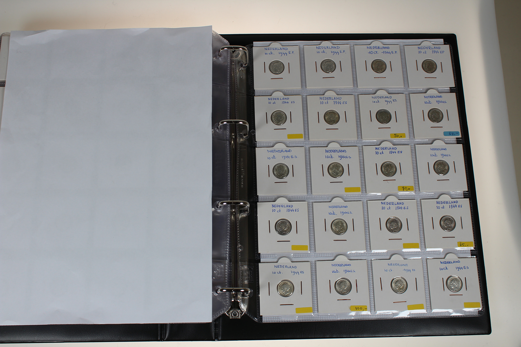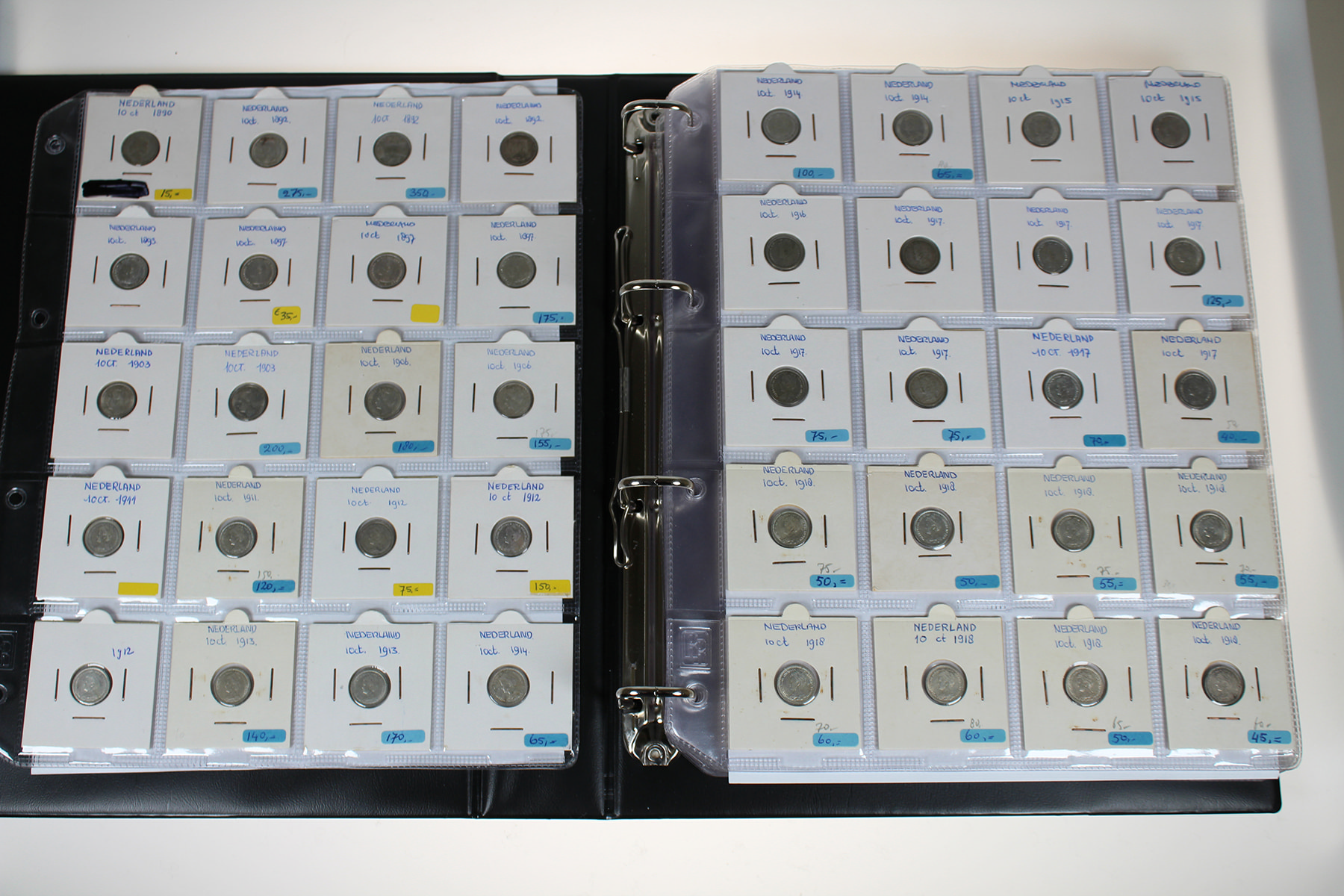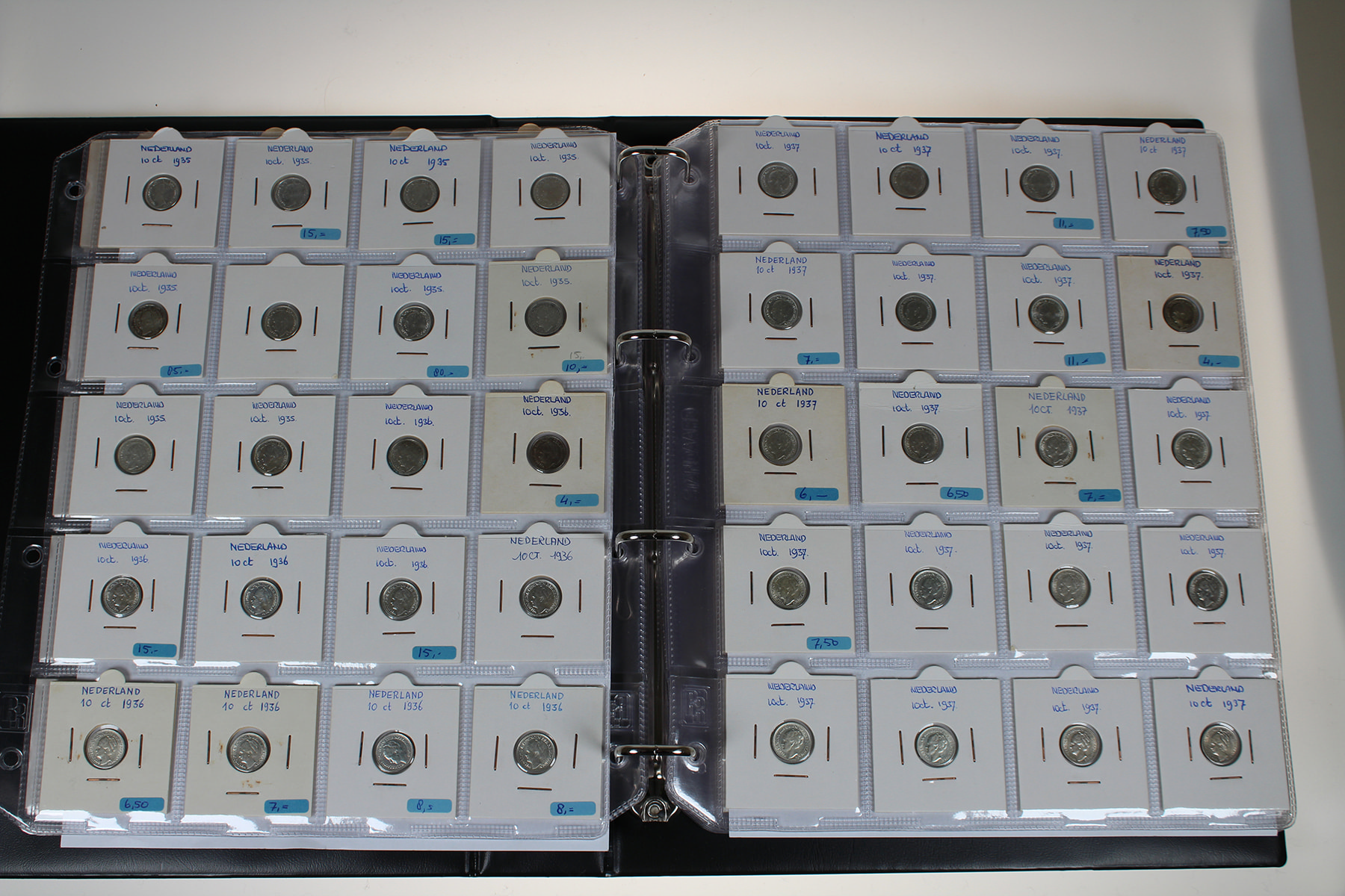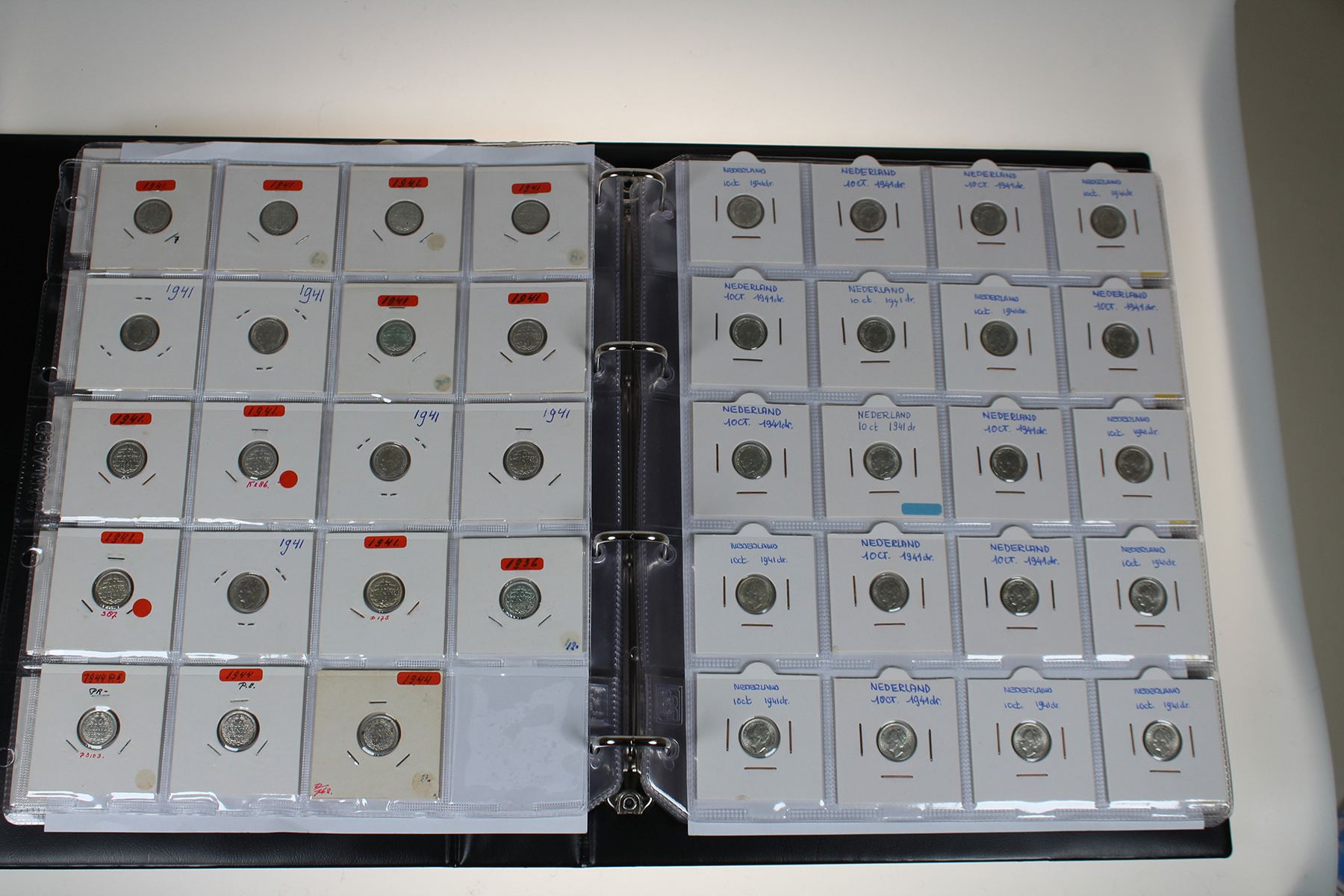 Blauw album met 300 stuks zilveren dubbeltjes Wilhelmina 1892-1944. Veel dubbeltjes tijdens WOII geslagen in de USA. In topkwaliteit!