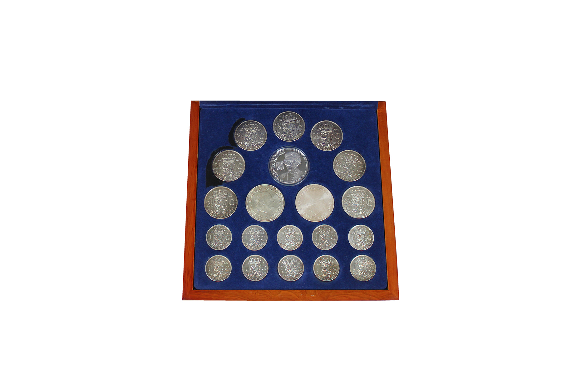 Luxe kist “Zilverschat van Juliana” met alle zilveren munten + zilveren penning. Uitgifte KNM.