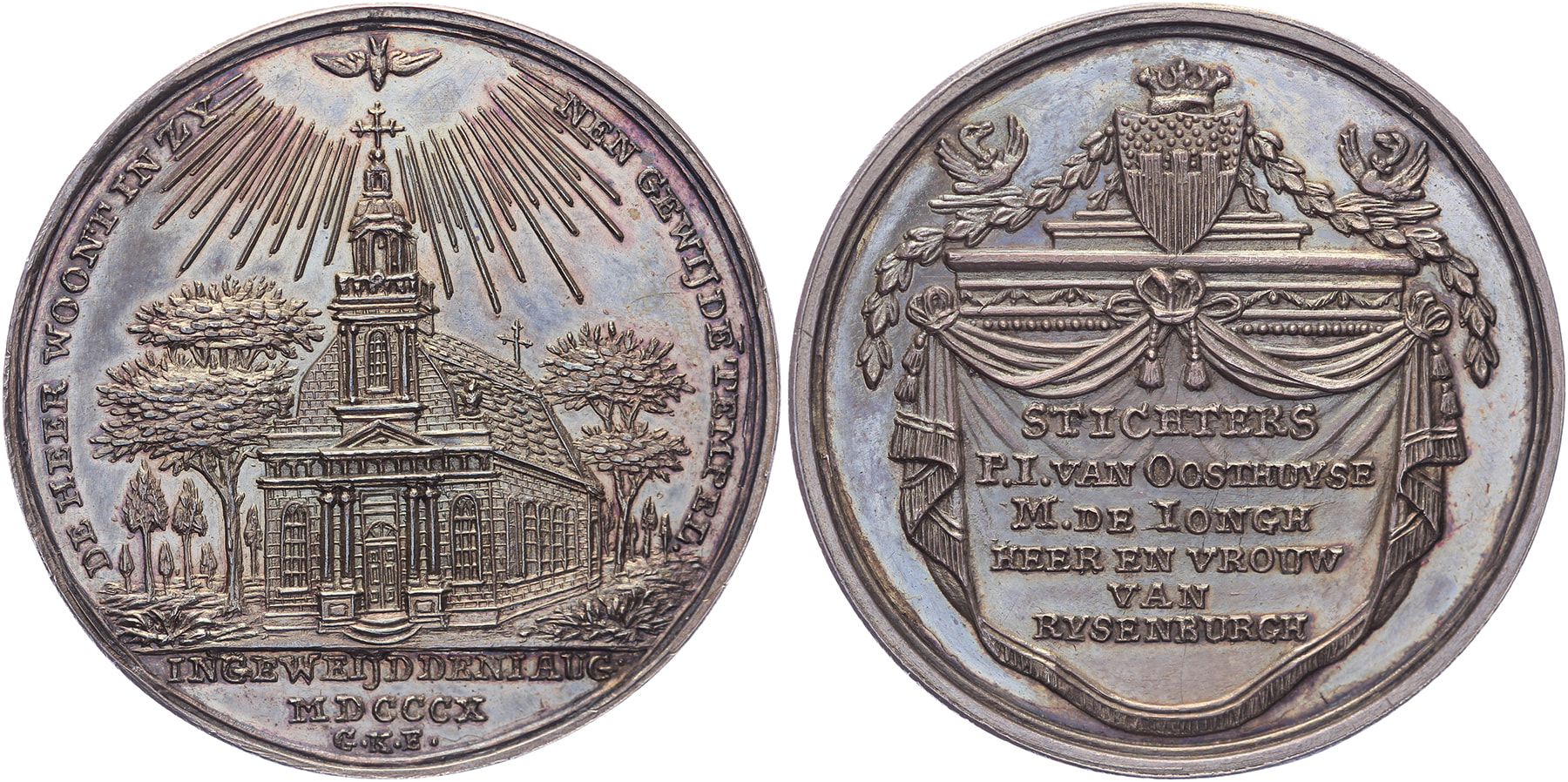 1810 Rijsenburg. Inwijding R.K.-kerk. Kerk onder stralende zon. / Wapenschild op hangend doek.AR 40,5 [18,75 gram]. Nahuys II pl. VIII-56; DPR IV-2874. G. Klouzing. In palmhouten doosje. Prachtig.