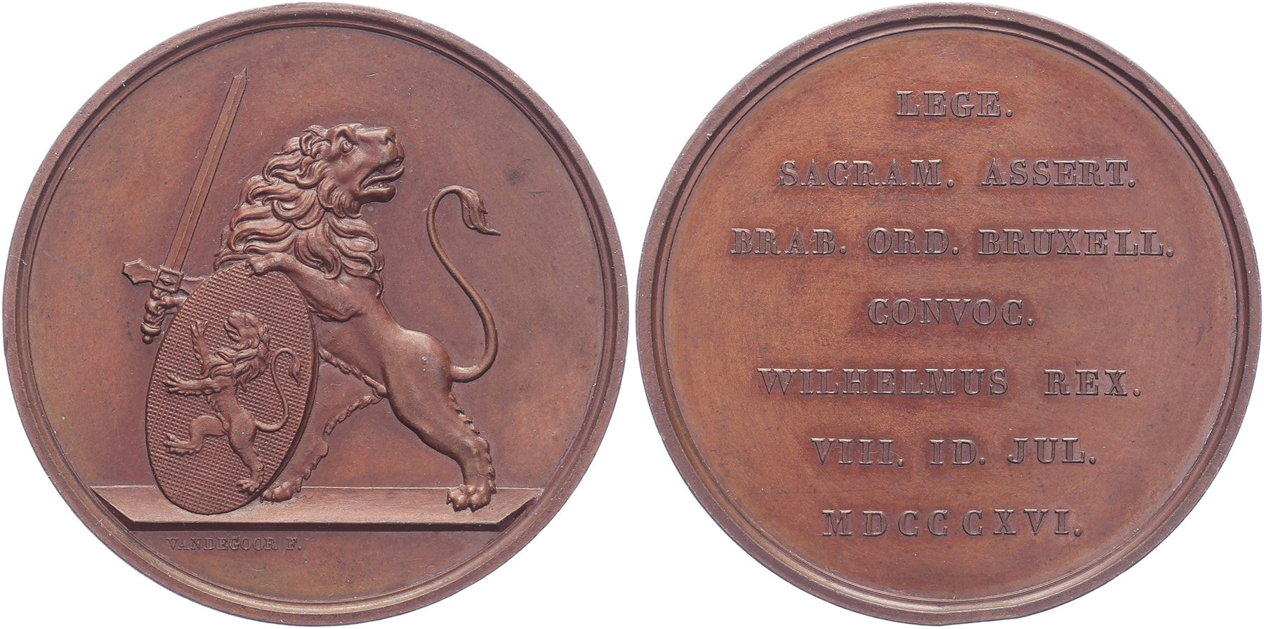 1816 Brussel, 1e vergadering Provinciale Staten van Brabant. Staande leeuw. / Zevenregelig opschrift. Æ 47. Dirks 77. P.W. van de Goor. Prachtig.