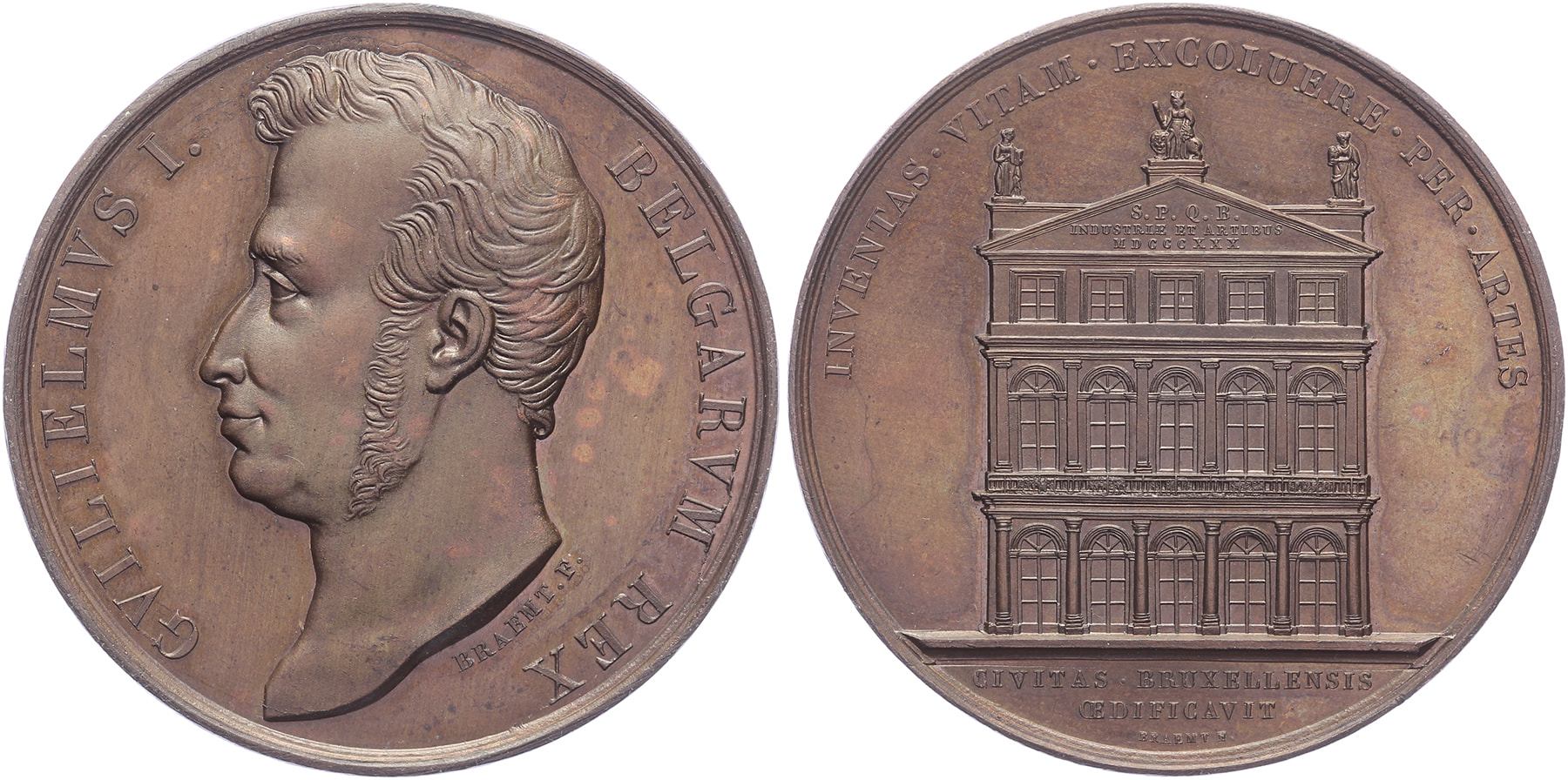 1830 Brussel, nijverheidstentoonstelling. Buste Willem I naar links. / Façade Paleis van Nijverheid. Æ 46,5. Dirks 338 variant. J. Braemt. Prachtig.