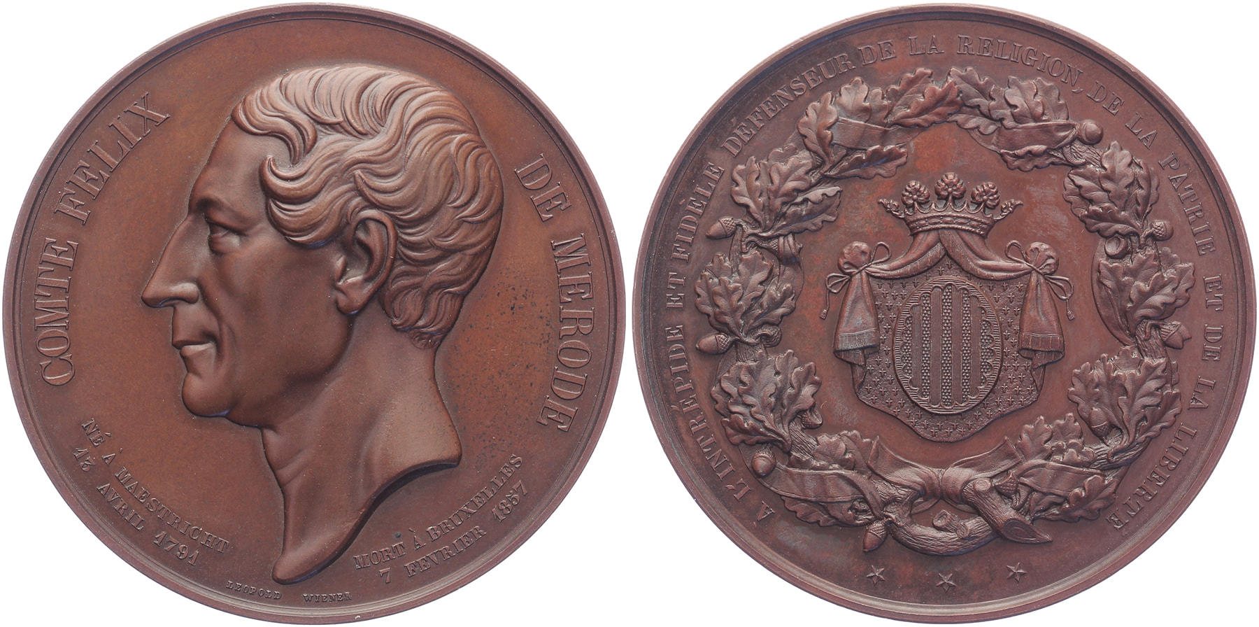 1857 Overlijden graaf Felix de Merode (Maastricht 1791 – Brussel 1857). Buste naar links. / Gedrapeerd wapen in krans. Æ68. L. Wiener. Prachtig.