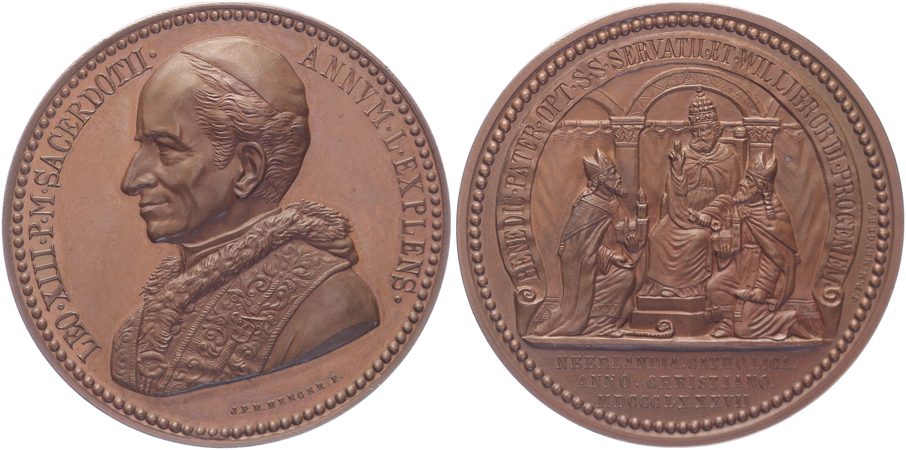 1887 Leo XIII – 50 jarig priesterschap. Buste Leo naar links. / Religieuze scène met Petrus.Æ 51. Zwierzina 756. J.P.M. Menger. FDC.