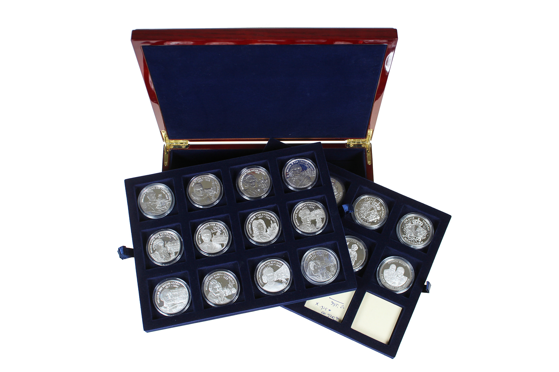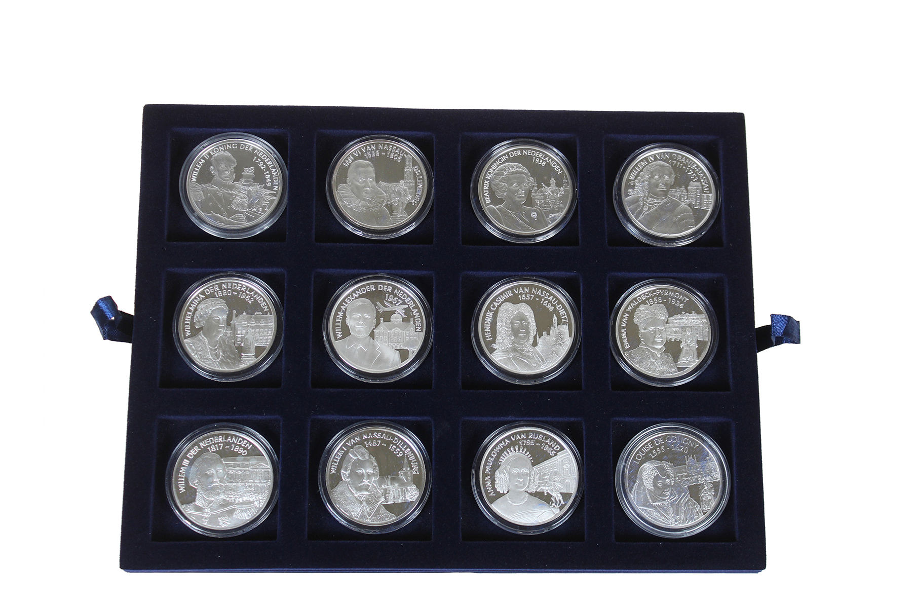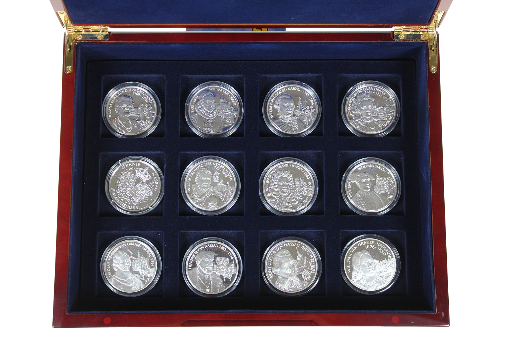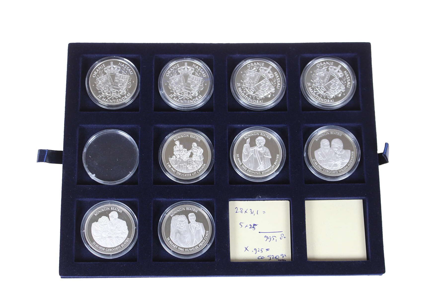 Bruine kist met 33 sterling zilveren penningen, series ‘Oranje-Nassau’ en ‘Prinses Beatrix’. Netto ca. 920 gram zilver. Inclusief map met certificaten.