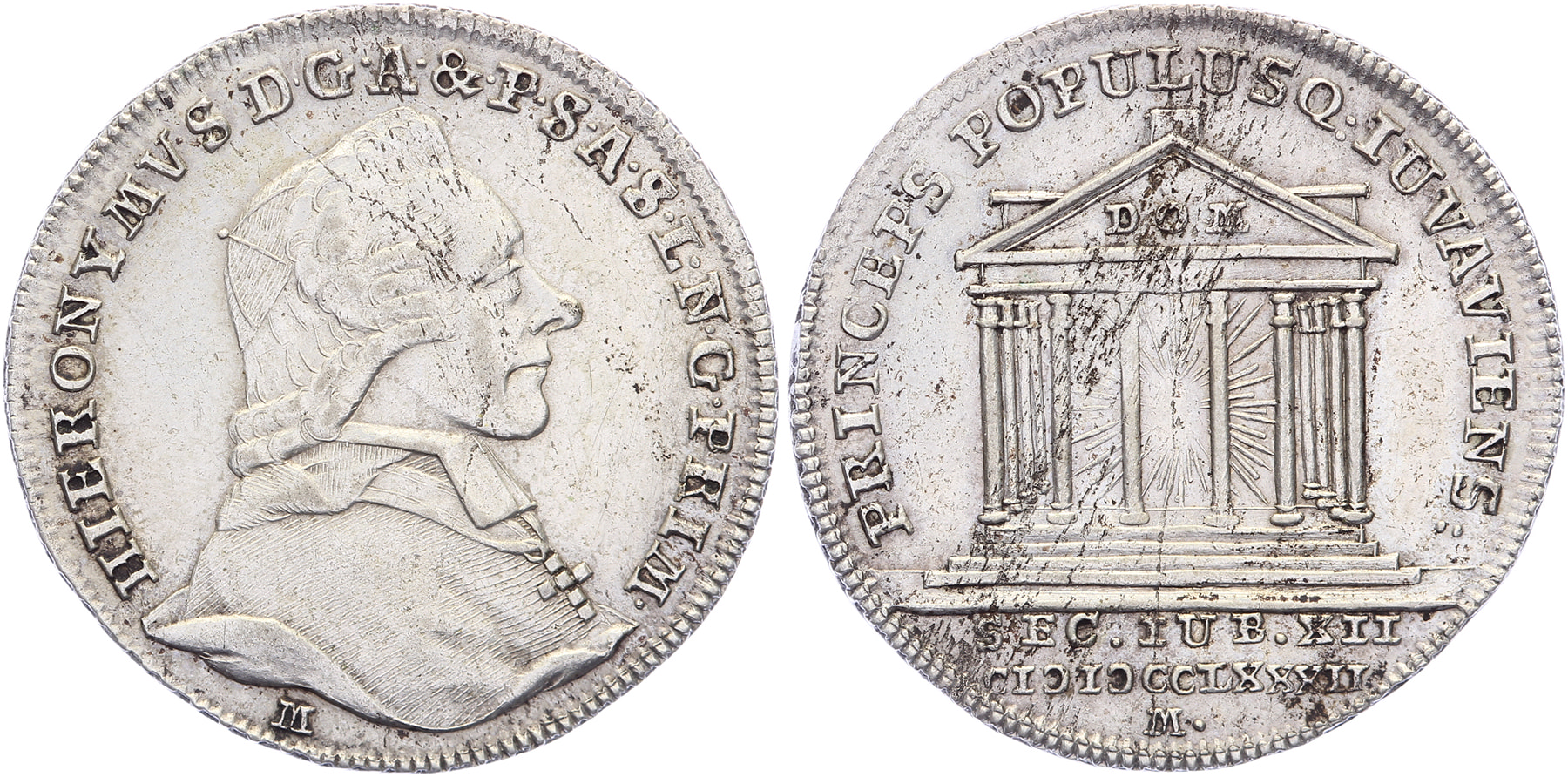 1782 Salzburg, auf das 1200jährige Stiftsjubileum. Brustbild Erzbischof Hieronymus von Colleredo nach rechts. / Antiker Tempel, innen Strahlen. AR 25 [3,86 gr.]. Probszt -; Comp. KM Pn12. F. Matzenkopf. Vorzüglich.