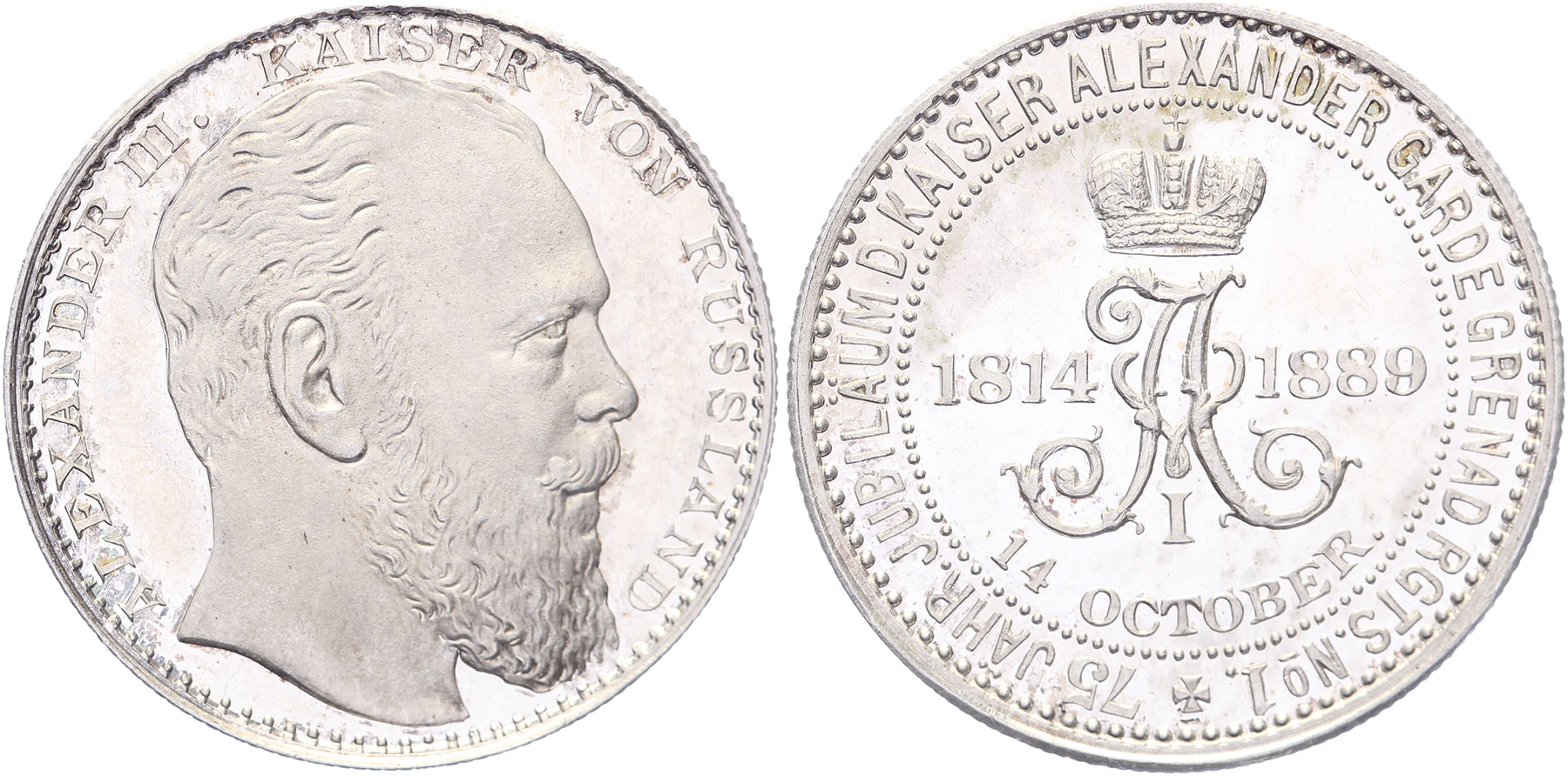 1889 Auf das 75jährige Bestehen des Garderegiments Alexander I. Büste rechts. / Monogramm Alexanders I. zwischen 1814-1889.AR 28,5 [9,20 gr.]. Diakov 1022.1. Selten. Fast Stempelglanz.