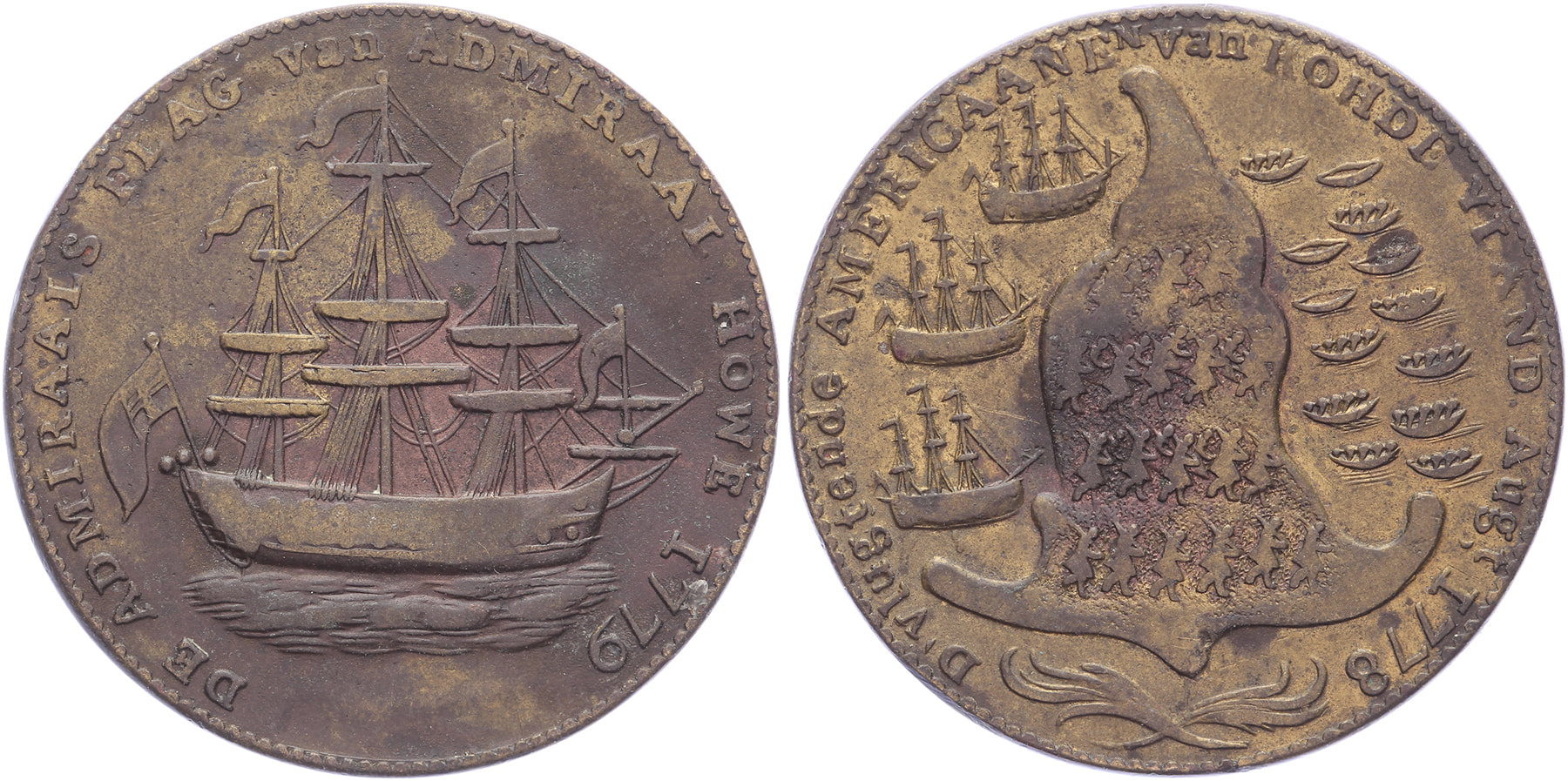 1779 Rhode Island ship token without wreath below ship. Sailing ship hoisting five flags. / Nineteen tiny silhouettes of armed men; three sailing ships left; 13 canoes right. Brass 32. KM Tn 27a. VF.