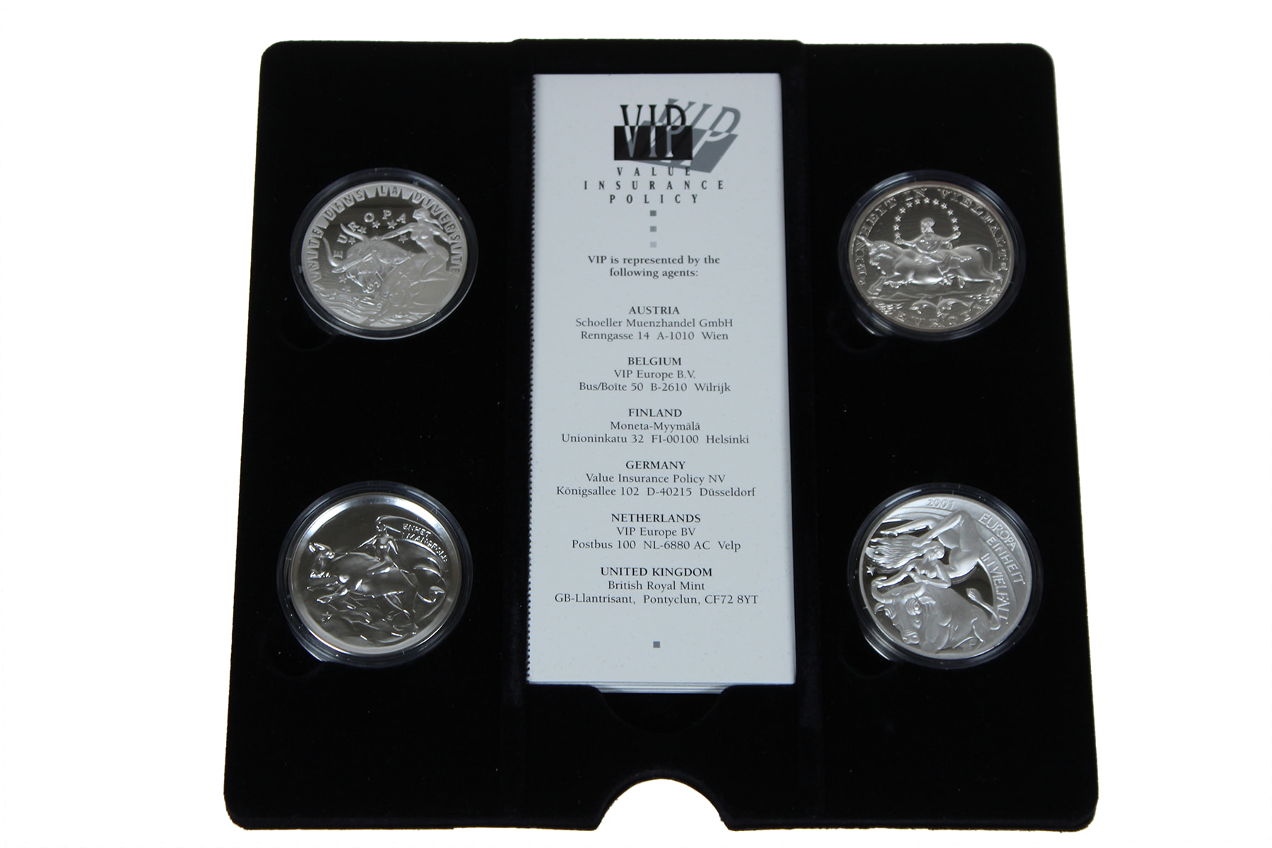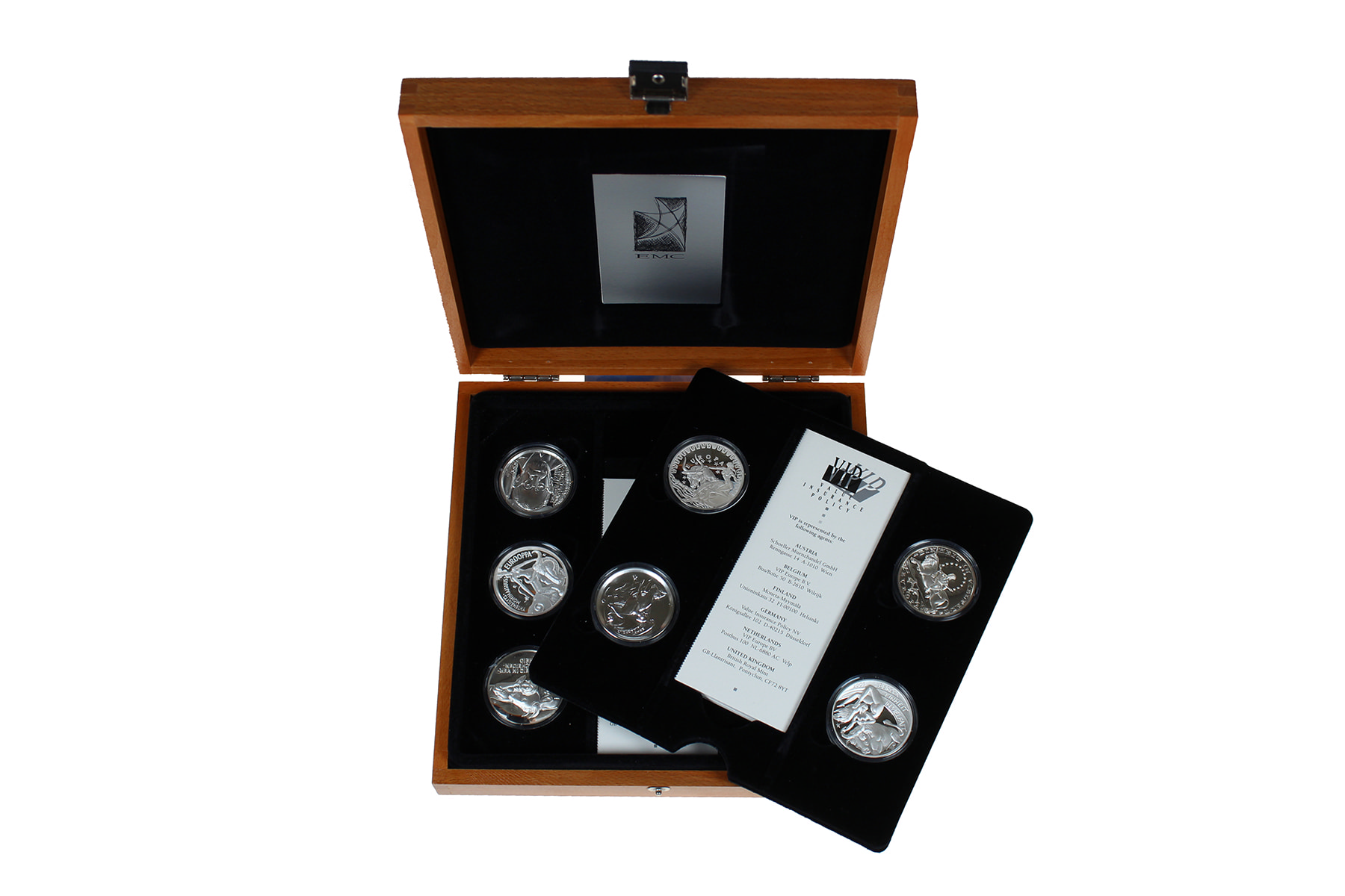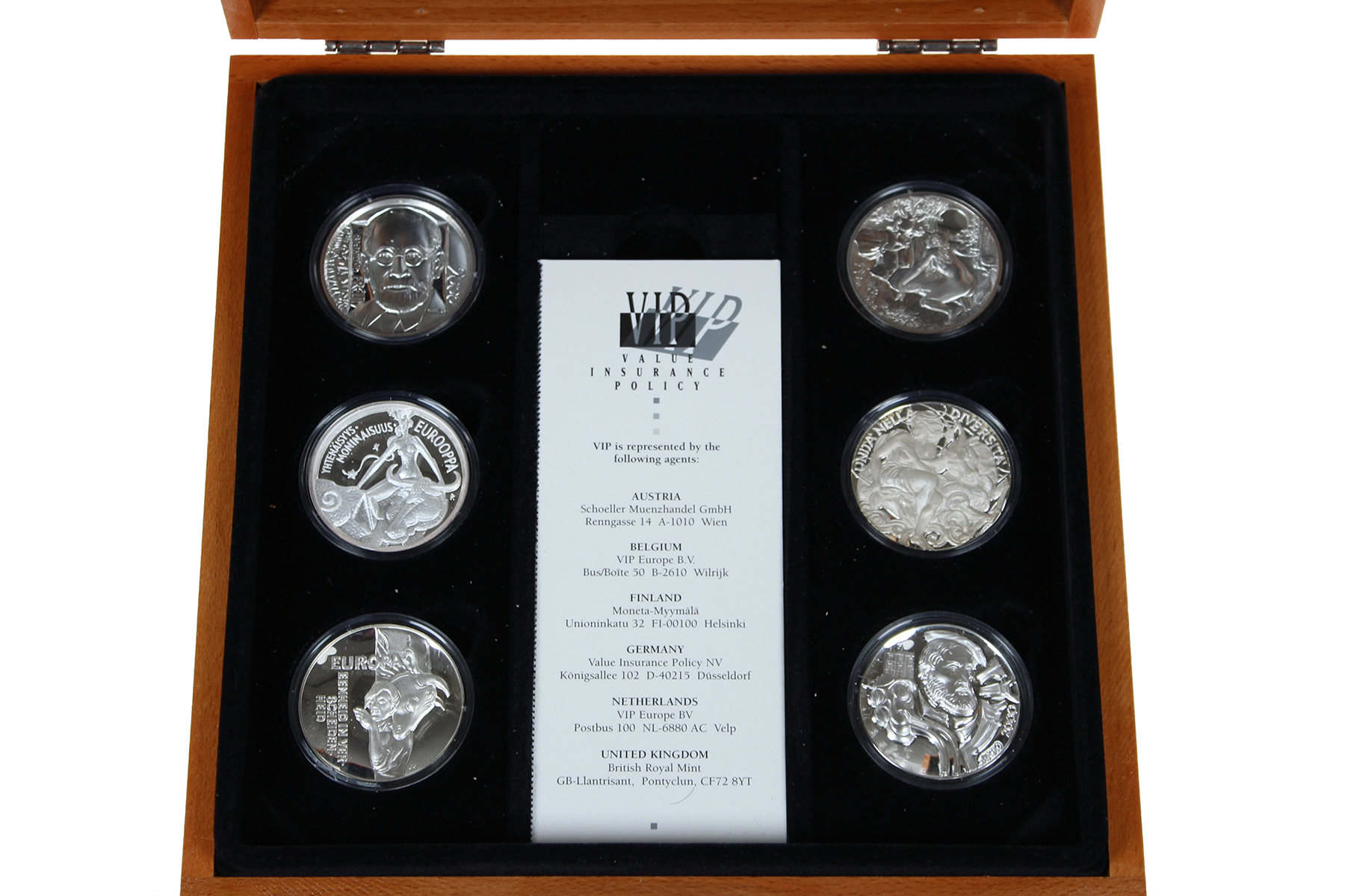 Houten cassette met 8 stuks sterling zilveren penningen uit de serie Officiële European Medal Club penning collectie. Bruto 372,8.