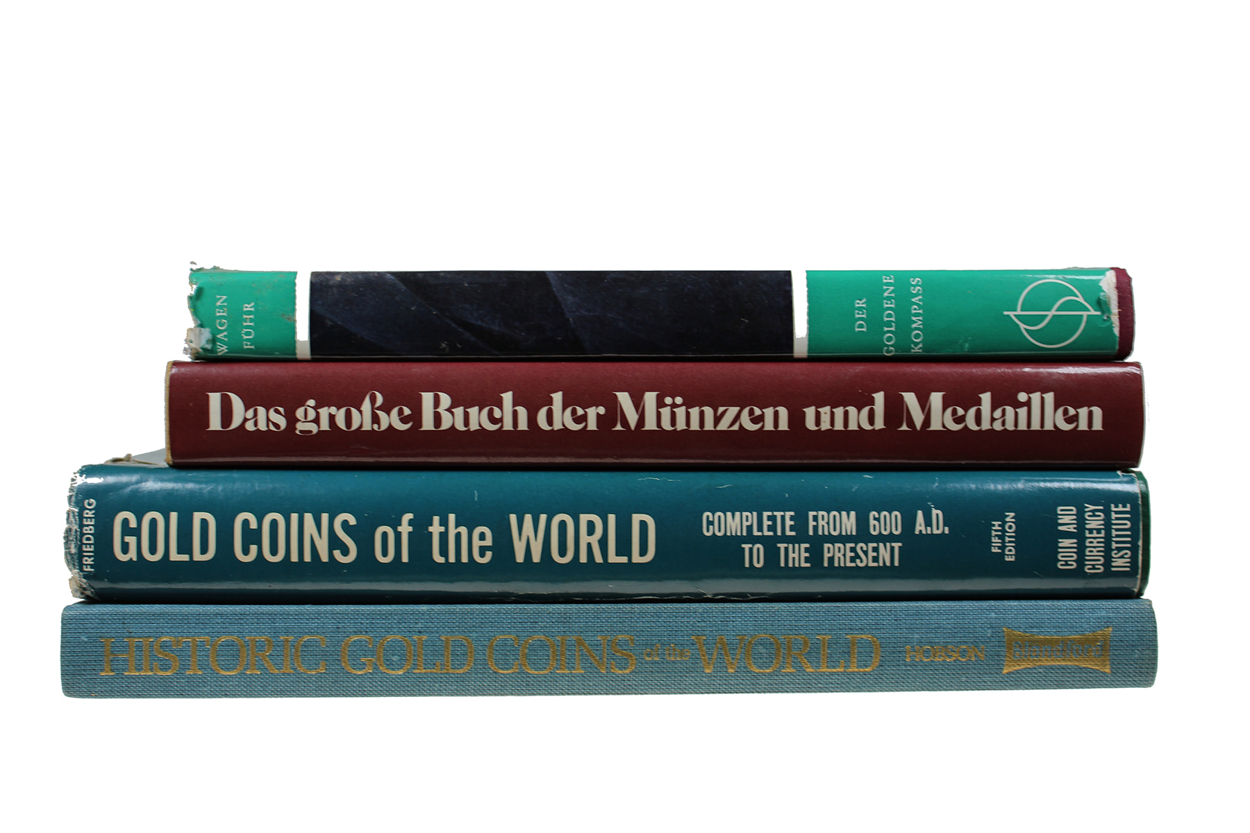 Lot (4) literatuur m.b.t. gouden munten van de wereld. O.a. Historic gold coins of the world (Hobson, B); Friedberg (5th edition); Der Goldene Kompass (Wagenführ, H.). Toegevoegd: Clain-Stefanelli, Vladimir & Elvira - Das große Buch der Münzen und Medaillen.