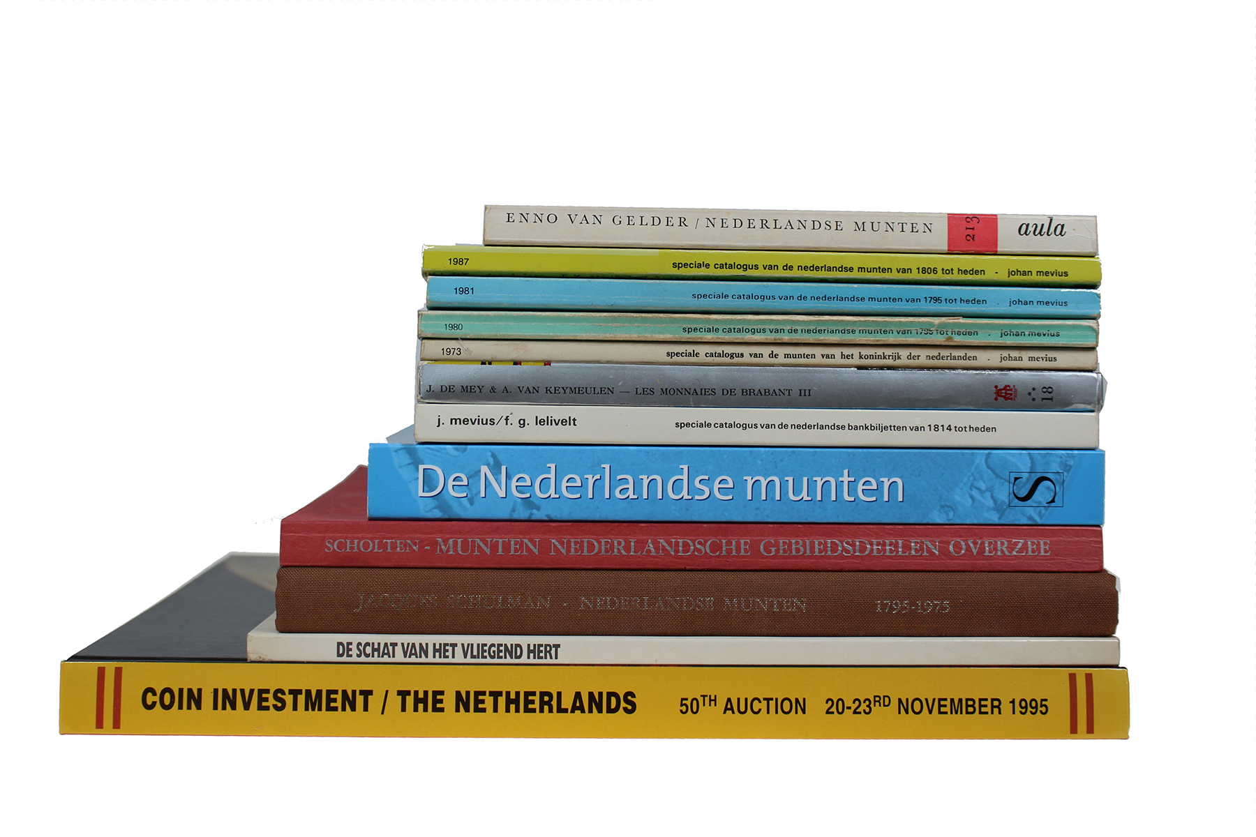 Lot (12) Literatuur m.b.t. Nederlandse munten. O.a. Nederlandse munten 1795-1975 (Schulman, J.); Munten der Nederlandsche gebiedsdelen (Scholten, C.); Speciale catalogus van Nederlandse munten (Mevius, J.).