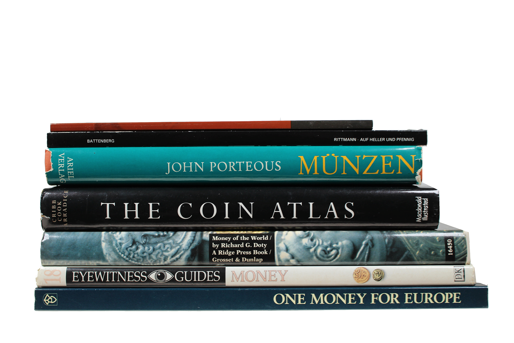 Lot (7) buitenlandse literatuur m.b.t. munten. Alle boeken in zeer goede staat, vrijwel ongebruikt. O.a. The Coin Atlas (Cribb, Cook, Carradice); Money of the World (Doty, R.G); Münzen (Porteous, J.).