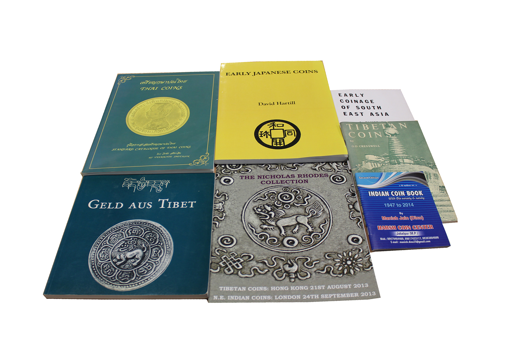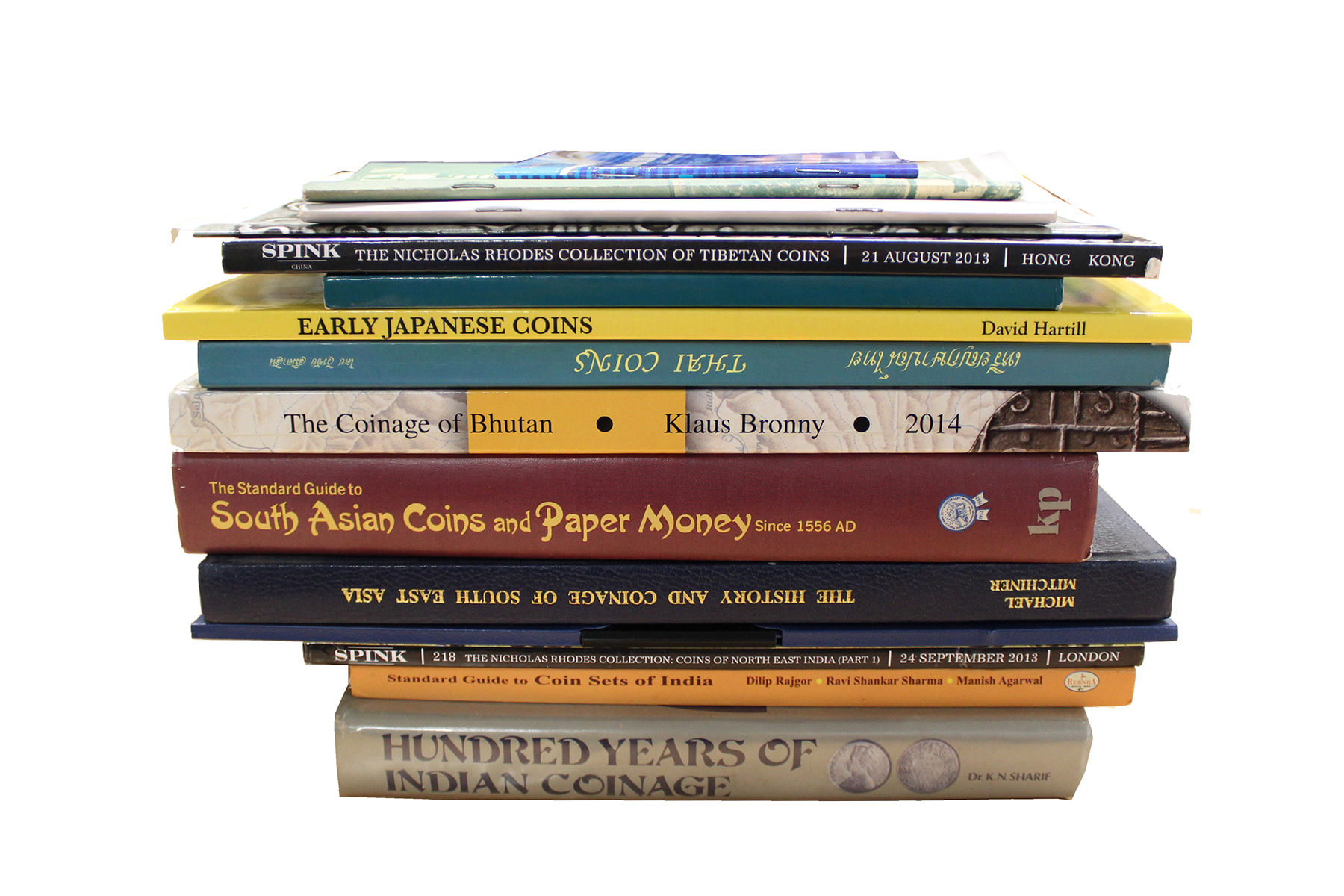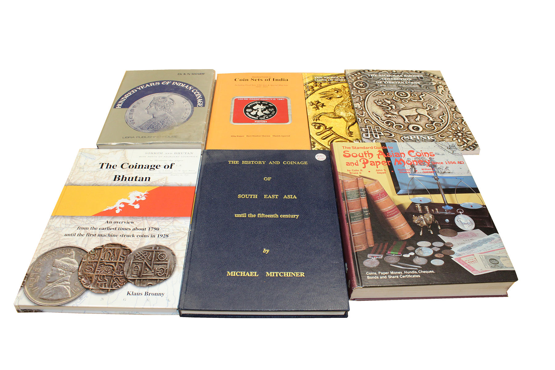 Lot (15) diverse literatuur m.b.t. Azië, o.a. Indian Coinage, South Asian coins and paper money, Coinage of Bhutan, Thaicoins etc.