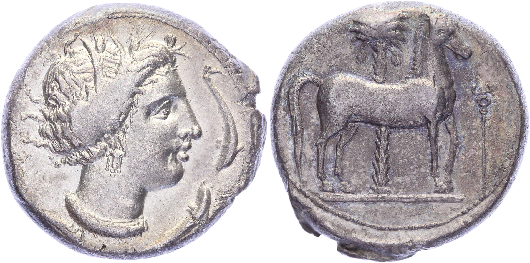 Circa 345/38-320/15 BC. AR Tetradrachme [16,31 gm, 25,60 mm]. Head of Arethusa right, wearing wreath of grain ears, triple-pendant earring, and ornate necklace with pendants; three dolphins around / Horse standing right; palm tree in background, kerykeion to right. Jenkins, Punic 90 L (O31/R81). Obverse softly struck in high points, EF.