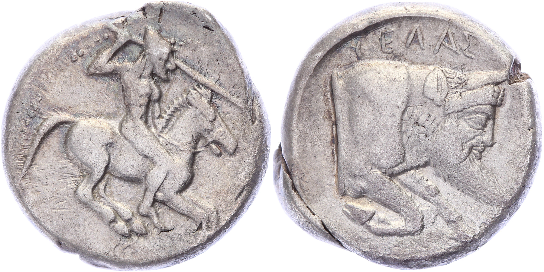 Circa 490-475 BC. AR Didrachm [8,31 gm, 19,40 mm]. Nude horseman on horse galloping right, thrusting spear with his raised right hand / CΕΛΑΣ, forepart of man-headed bull right within circular incuse. Jenkins, Gela, Group Ib, 67 (O21/R30). VF.