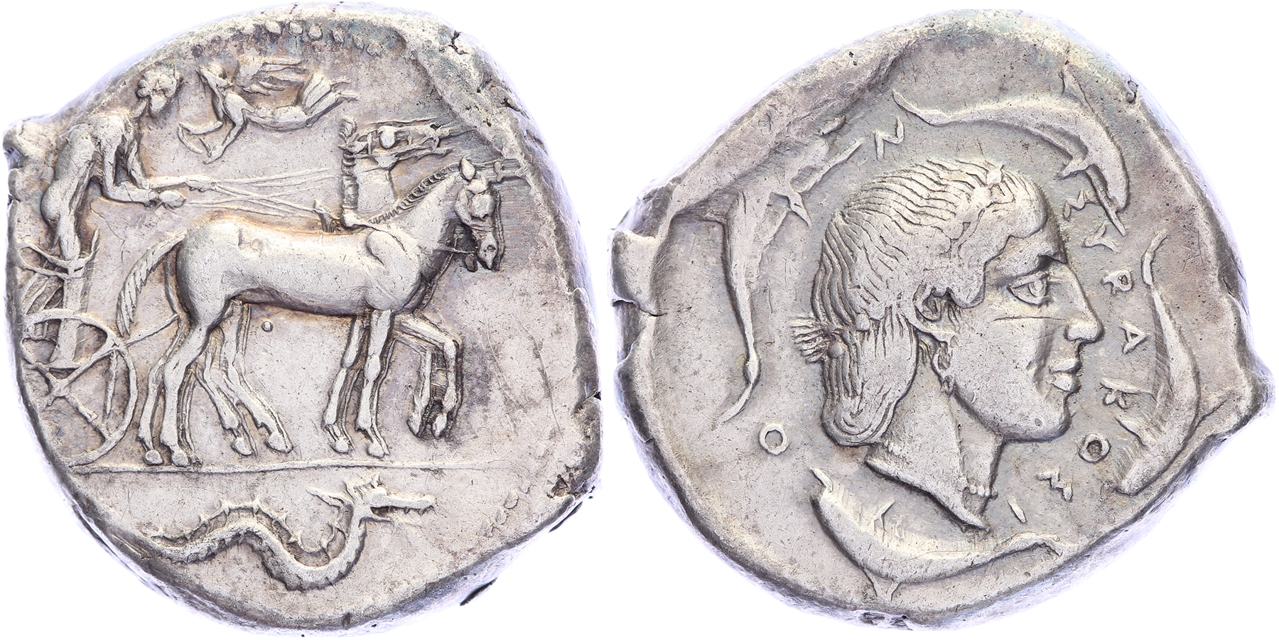 AR Tetradrachm [17,32 gm, 28,05 mm]. Struck circa 460-450 BC. Charioteer driving quadriga walking to right, holding goad in his right hand and the reins in both; above, Nike flying left to crown the driver; in exergue, ketos to right / ΣΥRΑΚΟΣ Ι-Ο-Ν Diademed head of Arethusa to right, wearing pendant earring and pearl necklace; around, four dolphins swimming to right. BMC 72 (same dies). Boehringer 481 (V256/R345). HGC 2, 1311. SNG ANS 149 (same dies). SNG Lloyd 1314 (same obverse die). SNG Munich 1012 (same dies). Obverse scratch, gVF.