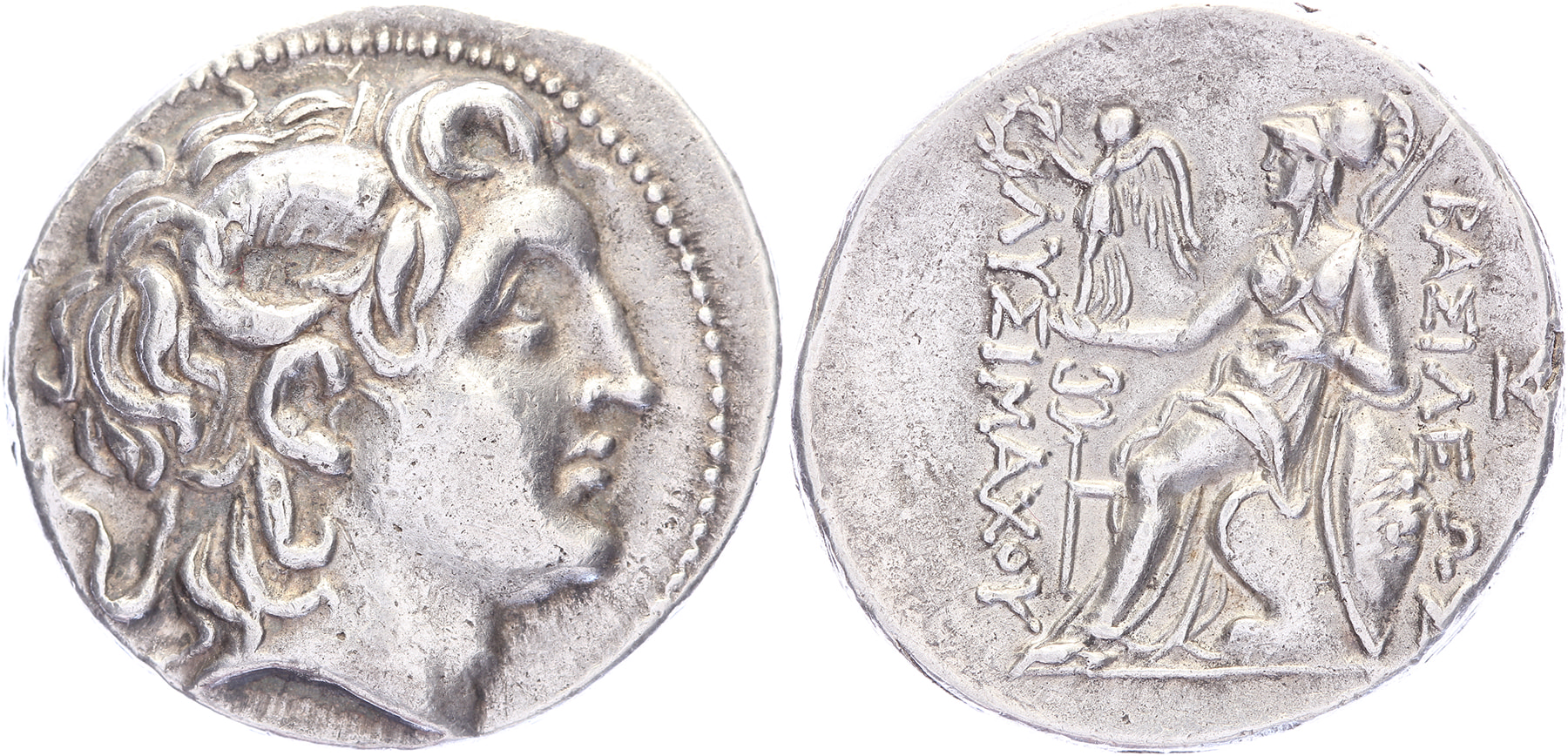AR Tetradrachm [17,16 gm, 30,65 mm]. Amphipolis mint. Struck 288/7-282/1 BC. Diademed head of the deified Alexander the Great to right, with horn of Ammon over his ear / ΒΑΣΙΛΕΩΣ ΛΥΣΙΜΑΧΟΥ, Athena seated to left on throne, holding Nike, crowning the king’s name, in her right hand, and leaning her left elbow on her shield; behind her, transverse spear; to left, kerykeion with handle to right; to outer right, monogram. Thompson 193. aEF.