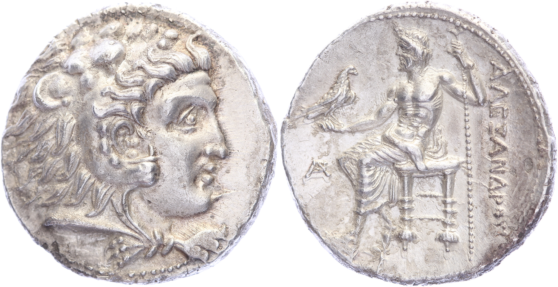 AR Tetradrachm [16,91 gm, 27,90 mm]. Byblos (or Arados?). Circa 330-320 BC (or 320-315 BC). Head of Herakles to right, wearing lion skin headdress / ΑΛΕΞΑΝΔΡΟΥ, Zeus Aëtophoros seated left on backless throne, holding long scepter with his left hand and eagle in his right; to left, monogram of ΑΡ. Price 3426; SNG München 745; SNG Oxford 3009. Choice EF.