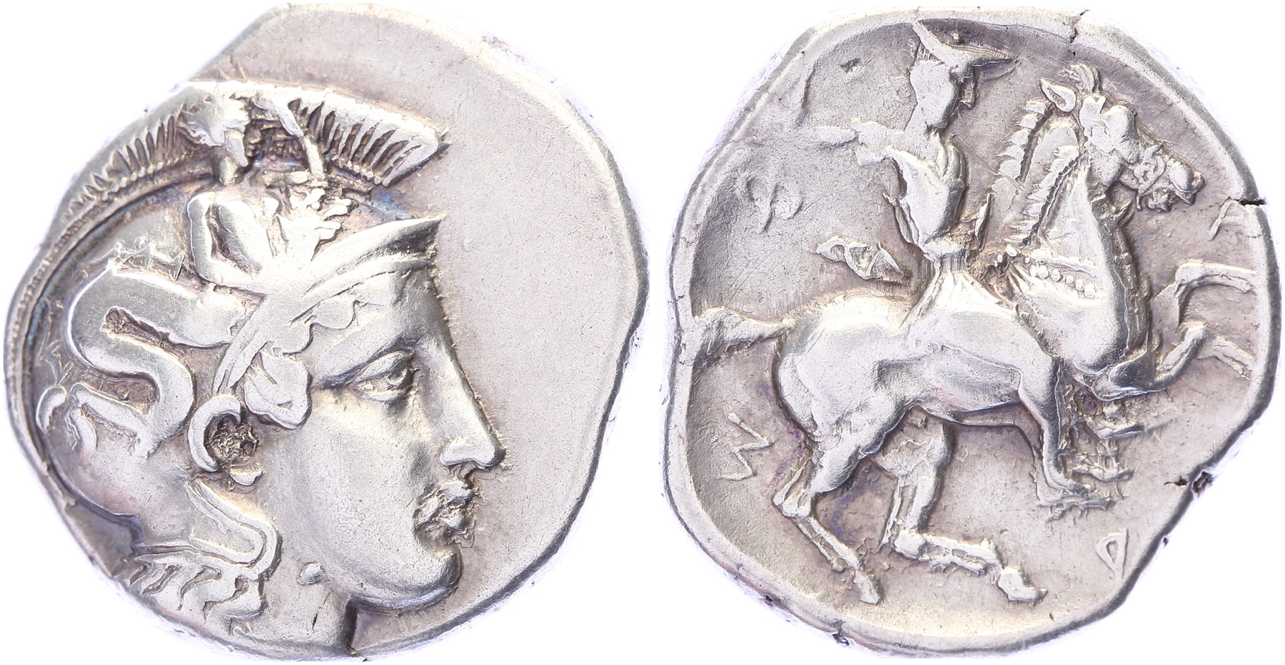 Late 5th-mid 4th century BC. AR Drachm [6,01 gm, 19,30 mm]. Signed by the engraver Telephantos. Head of Athena to right, wearing pearl necklace and a crested Attic helmet adorned with a figure of Skylla to right, her left hand raised to shade her eyes; in tiny letters behind neck, [TH / MI] / Φ-A / P-Σ (last two letters retrograde). VF.