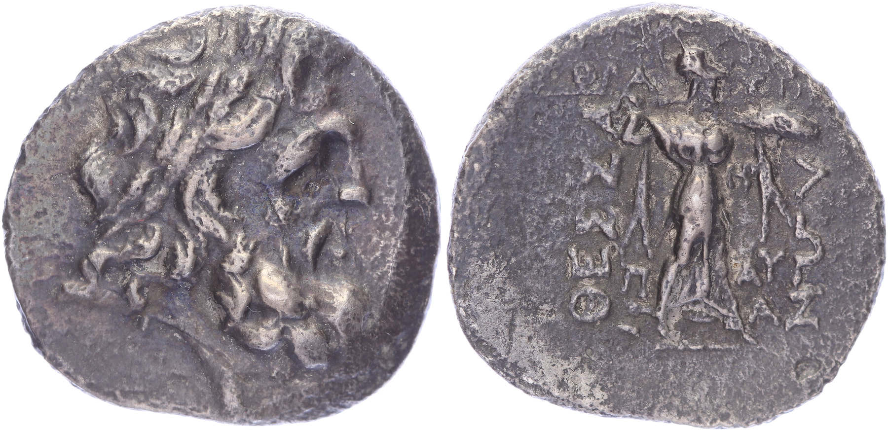AR Stater [5,40 gm, 21,10 mm]. Thrasylo(s), Her(a)..., and Pausa(nias), magistrates. Head of Zeus right, wearing oak wreath / Athena Itonia advancing right, holding spear and shield; ΘΕΣΣΑ−ΛΩΝ flanking, ΘPA-ΣΥΛO above spear, HP monogram in upper inner right field, Π-AY/Σ-A across lower central field. BCD Thessaly II 857.5 (same dies). Darkly toned VF.