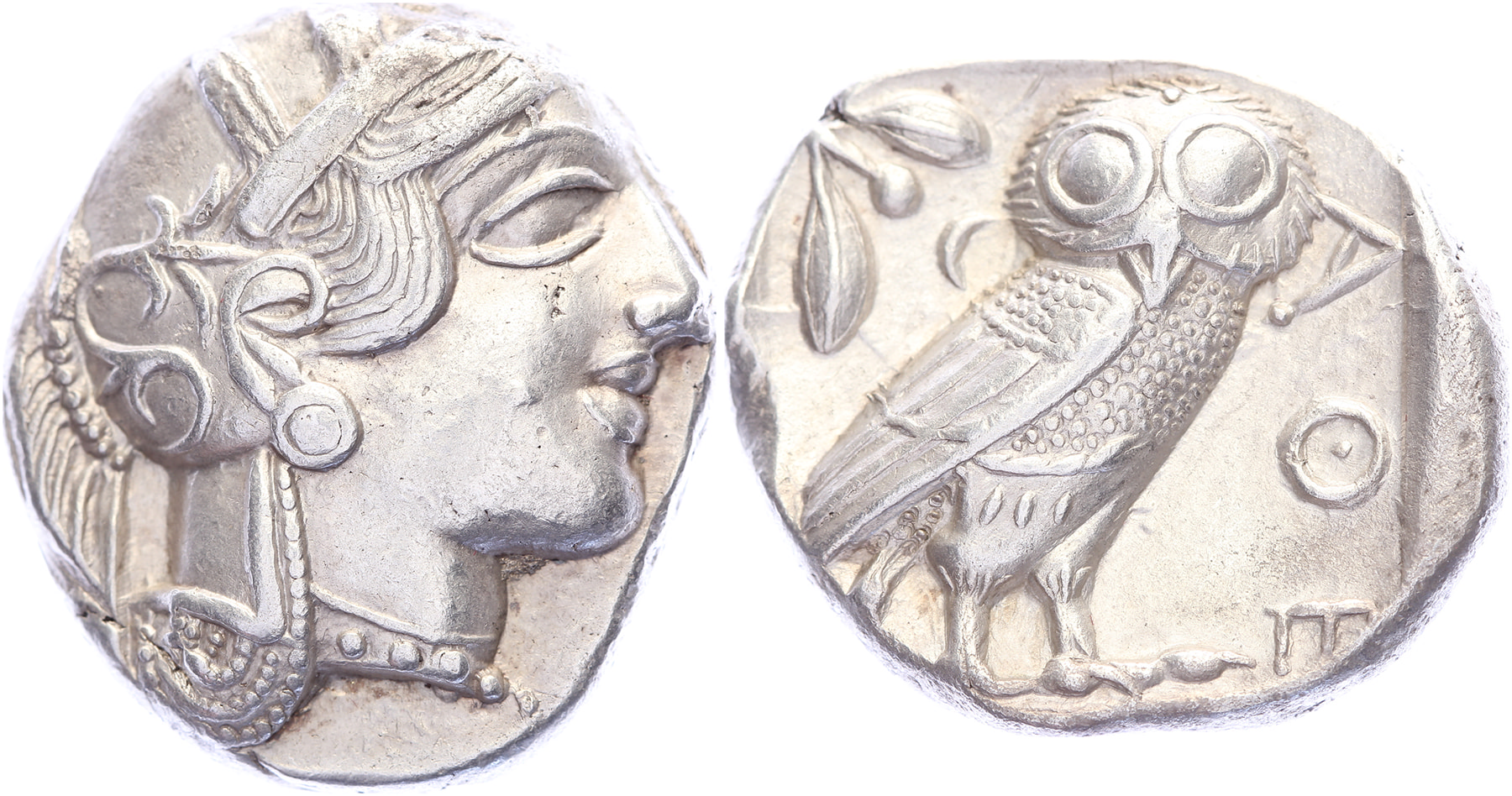 Circa 460-440 B.C. AR Tetradrachm [17,14 gm, 22,10 mm]. Head of Athena right, wearing multiple pendant necklace, round earring, and crested Attic helmet ornamented with three olive leaves over visor and spiral palmette on bow / ΑΘΕ, owl with closed wings standing three-quarters right, olive spring and crescent moon behind, all in incuse square. Starr 183; BMC 62. EF.