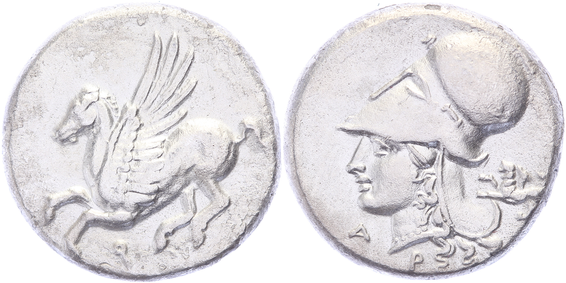 Circa 300 BC. AR Stater [8,34 gm, 21,00 mm]. Pegasos flying left / Head of Athena left, wearing laureate corinthian helmet; behind, chimera left; below, A-P. Ravel 1011; Calciati 429. Bright surfaces, once cleaned, VF.
