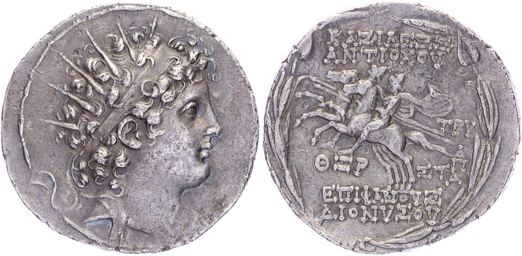 AR Tetradrachm [16,01 gm, 32,25 mm]. Antioch mint. Dated SE 169 (144/3 BC). Radiate and diademed head right / ΒΑΣΙΛΕΩΣ ΑΝΤΙΟΧΟΥ above, ΕΠΙΦΑΝΟΥΣ ΔΙΟΝΥΣΟΥ below, the Dioscuri galloping left; below, date ΘΞΡ; to right ΤΡΥ over monogram of ΙΑΡ and ΣΤΑ; all within laurel wreath. SMA 219 var. (reverse monogram). EF.