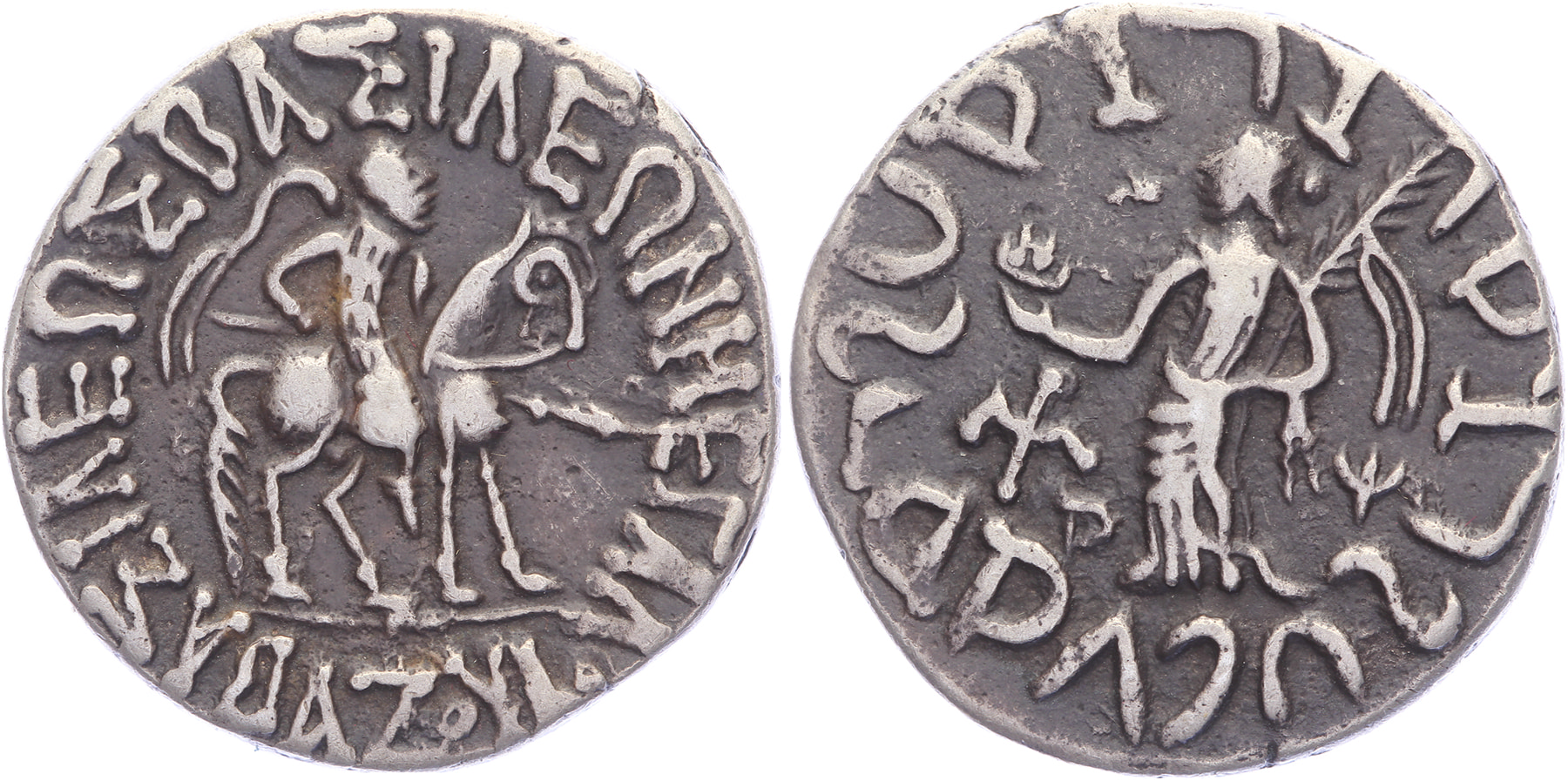 AR Tetradrachm [11,61 gm, 27,00 mm]. Uncertain mint in western Gandhara. ΒΑΣΙΛΕΩΣ ΒΑΣΙΛΕΩΝ ΜΕΓΑΛΟΥ ΑΟΖΥ, Scythian king advancing on horseback to right with lowered spear / Goddess standing left, holding lotus and filleted palm branch. Senior 82.213; MIG 743e; Hoover 627. Toned gVF.