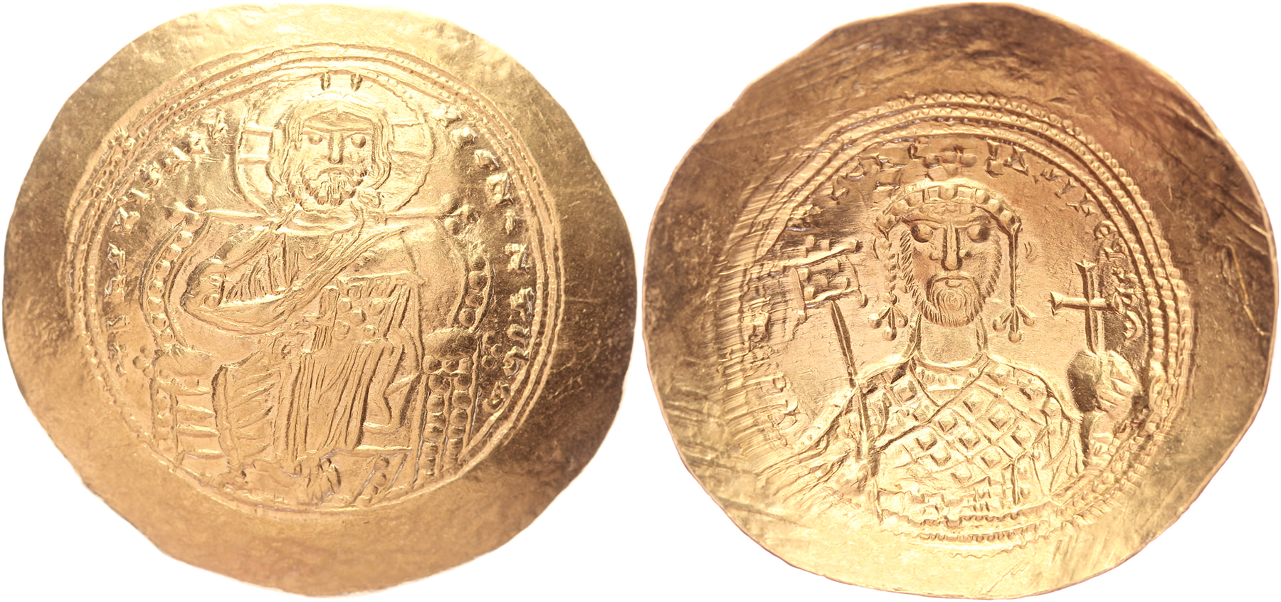 AV Histamenon Nomisma [4,41 gm, 28,50 mm]. Constantinople mint. IHS XI,S CX REgNANTIhm, Christ Pantokrator enthroned facing on suppedion, nimbate, raising hand in benediction and holding Gospels / χωνστ / Λτν / βΛΣΙΛΛΕςΣ Ρμ, crowned bust of Constantine IX facing front, wearing the loros, holding the labarum in his right hand and the cruciger globe in his left; triple grenetis. SB 1829; Ratto 1988; Do 2a; BMC 12. XF.