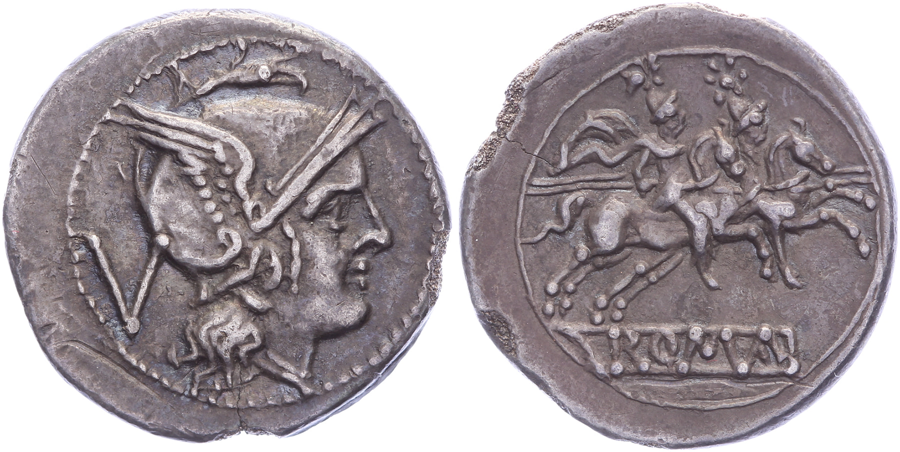 211-208 BC. AR Quinarius [2,24 gm, 16,50 mm]. Rome mint. Helmeted head of Roma right; denomination mark behind; V / Dioscuri on horseback riding right, each holding transverse spear; two stars above. Crawford 44/6; RSC 3; Sydenham 141. Crystalized silver showing around edges, otherwise toned gVF.