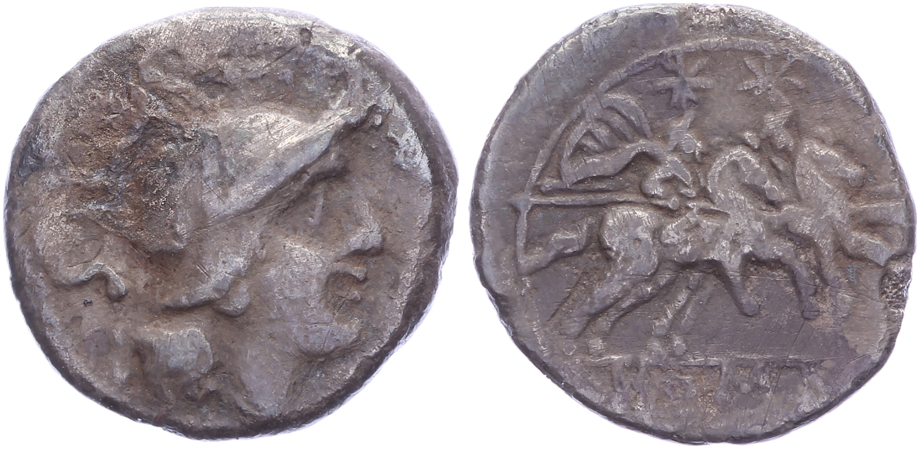 211-208 BC. AR Sestertius [0,96 gm, 12,55 mm]. Rome mint. Helmeted head of Roma right; IIS (mark of value) behind / Dioscuri on horseback riding right. Crawford 44/7; Sydenham 142; RSC 4. Crystalized silver, gF.
