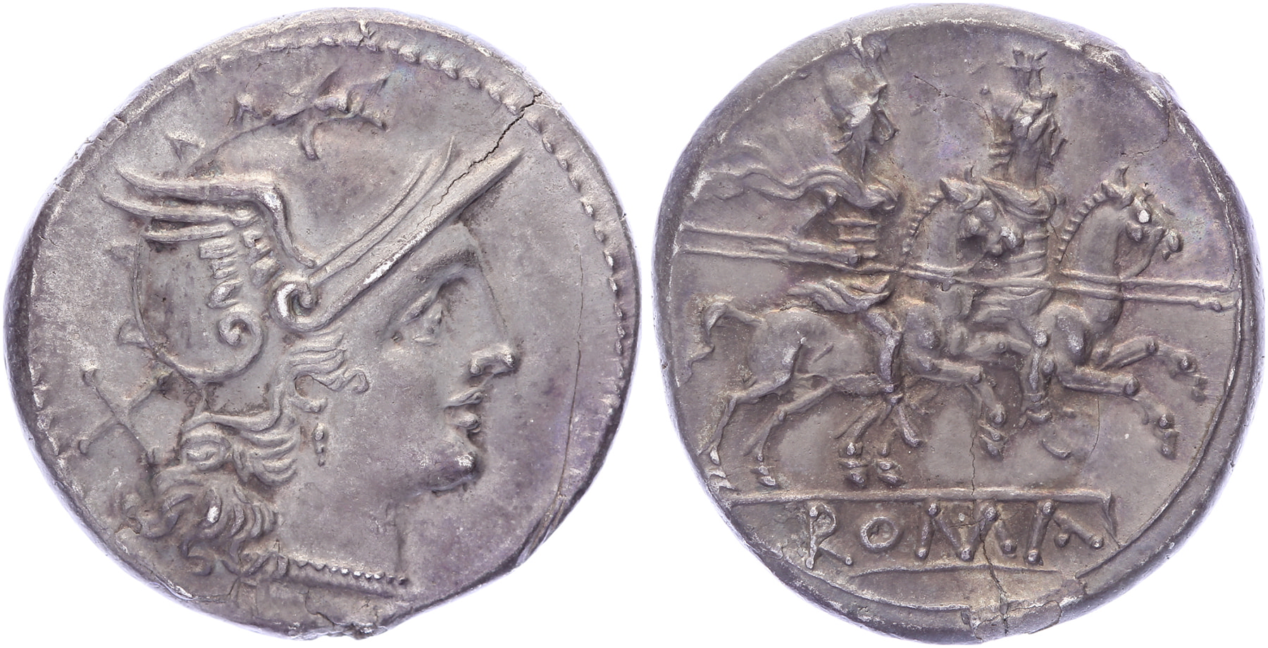 Fourré / plated Denarius [3,97 gm, 18,00 mm]. Rome mint. Struck 157/6 BC. Helmeted head of Roma right, X behind / Dioscuri riding right, ROMA in linear frame below. Crawford 198/1; Sydenham 207. Plating complete, EF.