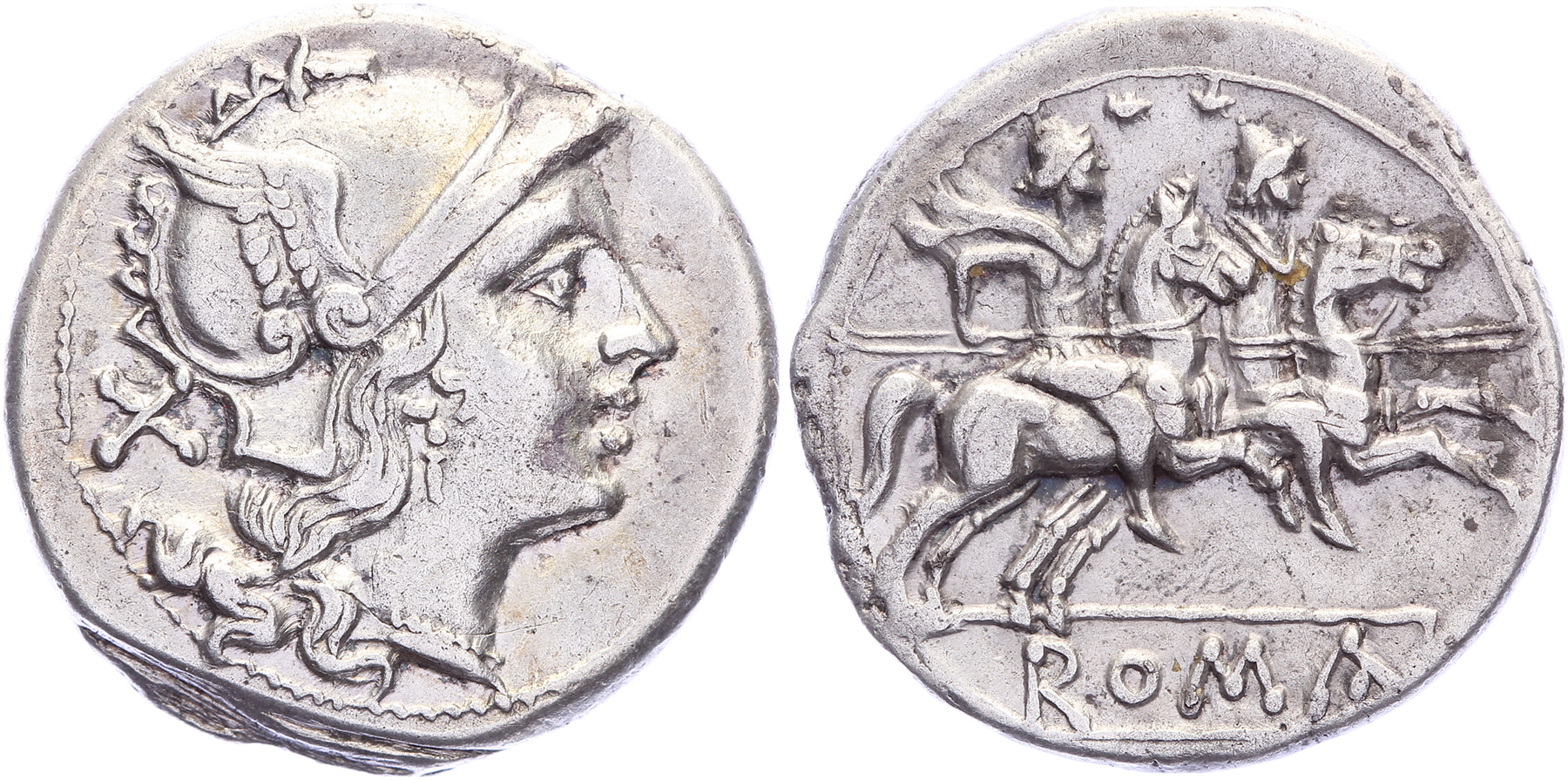 Fourré / plated Denarius [3,70 gm, 19,35 mm]. Rome mint. Struck 157/6 BC. Helmeted head of Roma right, X behind / Dioscuri riding right, ROMA in linear frame below. Crawford 198/1; Sydenham 207. Plating complete, EF.