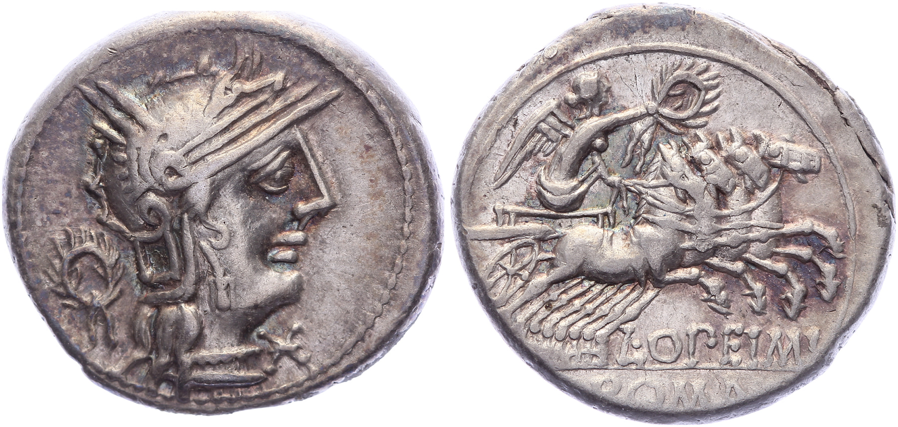 AR Denarius [3,91 gm, 18,30 mm]. Rome mint. Helmeted head of Roma right; tripod behind / Apollo driving galloping biga right, holding reins and ready to show arrow from bow, quiver over shoulder. Crawford 254/1; RSC Opimia 16. Toned EF.