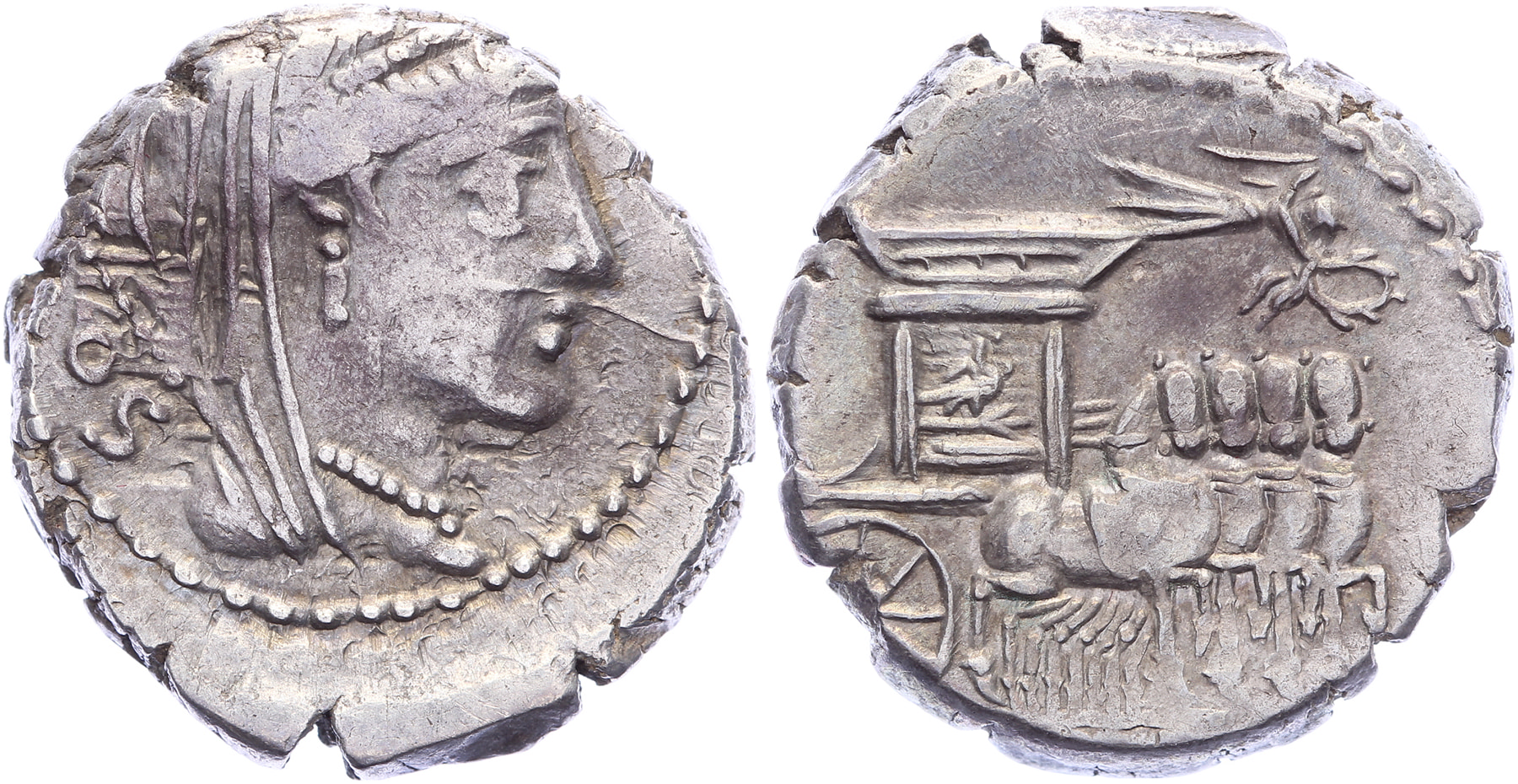 AR Denarius [4,09 gm, 18,30 mm]. Rome mint. Diademed and veiled head of Juno right, wearing pearl necklace; scepter over shoulder; behind, DOS downward / Triumphal quadriga right, side-panel decorated with eagle standing right on thunderbolt; above, Victory flying right, holding wreath; L • RVBRI below. Crawford 348/2; Sydenham 706; Rubria 2; BMCRR 2452; Kestner 3044-5; RBW 1323. Off centre, obverse die break, EF for wear.