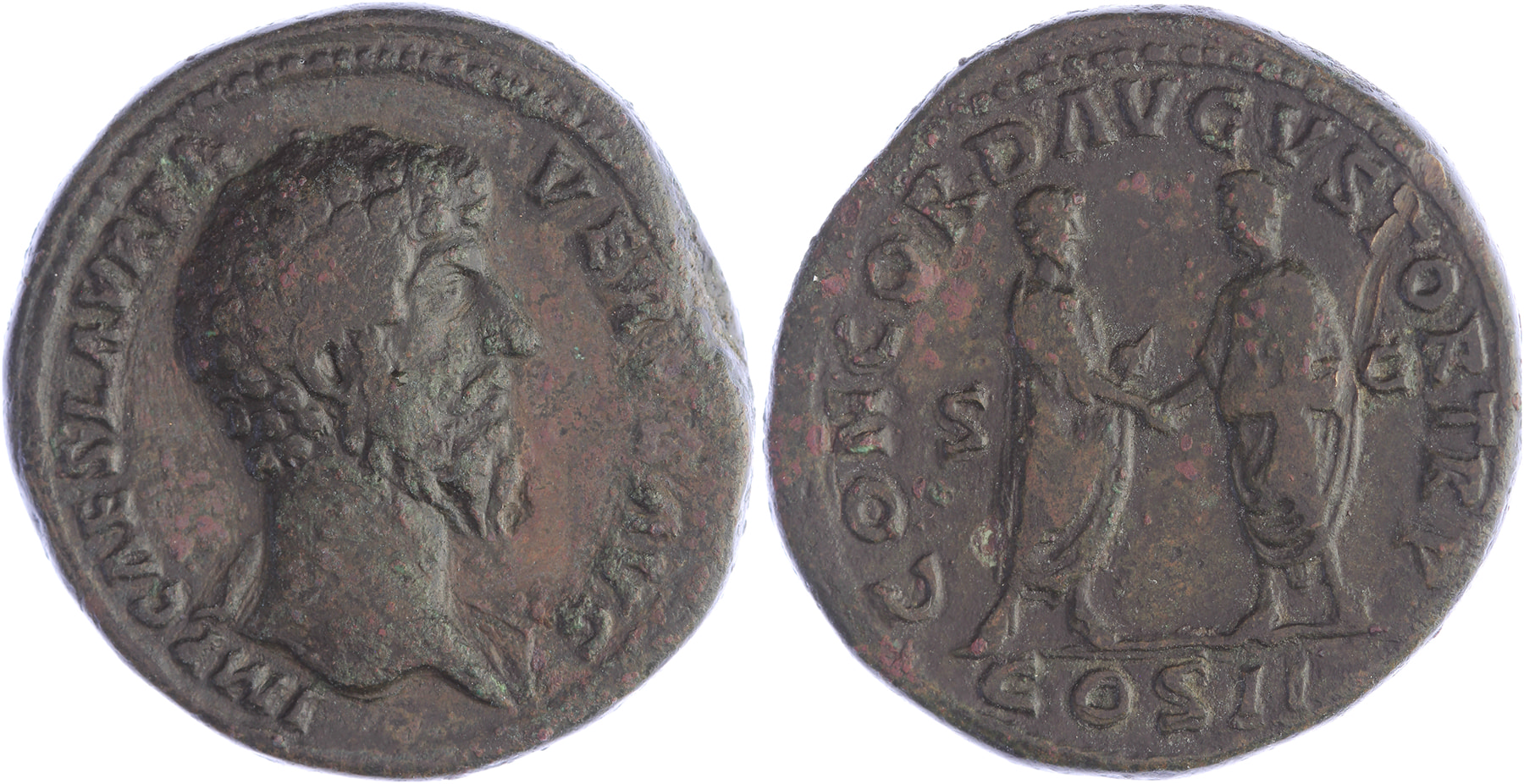 Æ Sestertius [25,34 gm, 33,90 mm]. Rome mint. Struck 161 AD. IMP CAES L AVREL VERVS AVG, laureate head right / CONCORDIA AVGVSTOR S C, Marcus Aurelius standing right holding volumen and Lucius Verus standing left clasping hands with one another, COS III in exergue. RIC 1284; Cohen 31. Some tooling and minor smoothing, aVF.