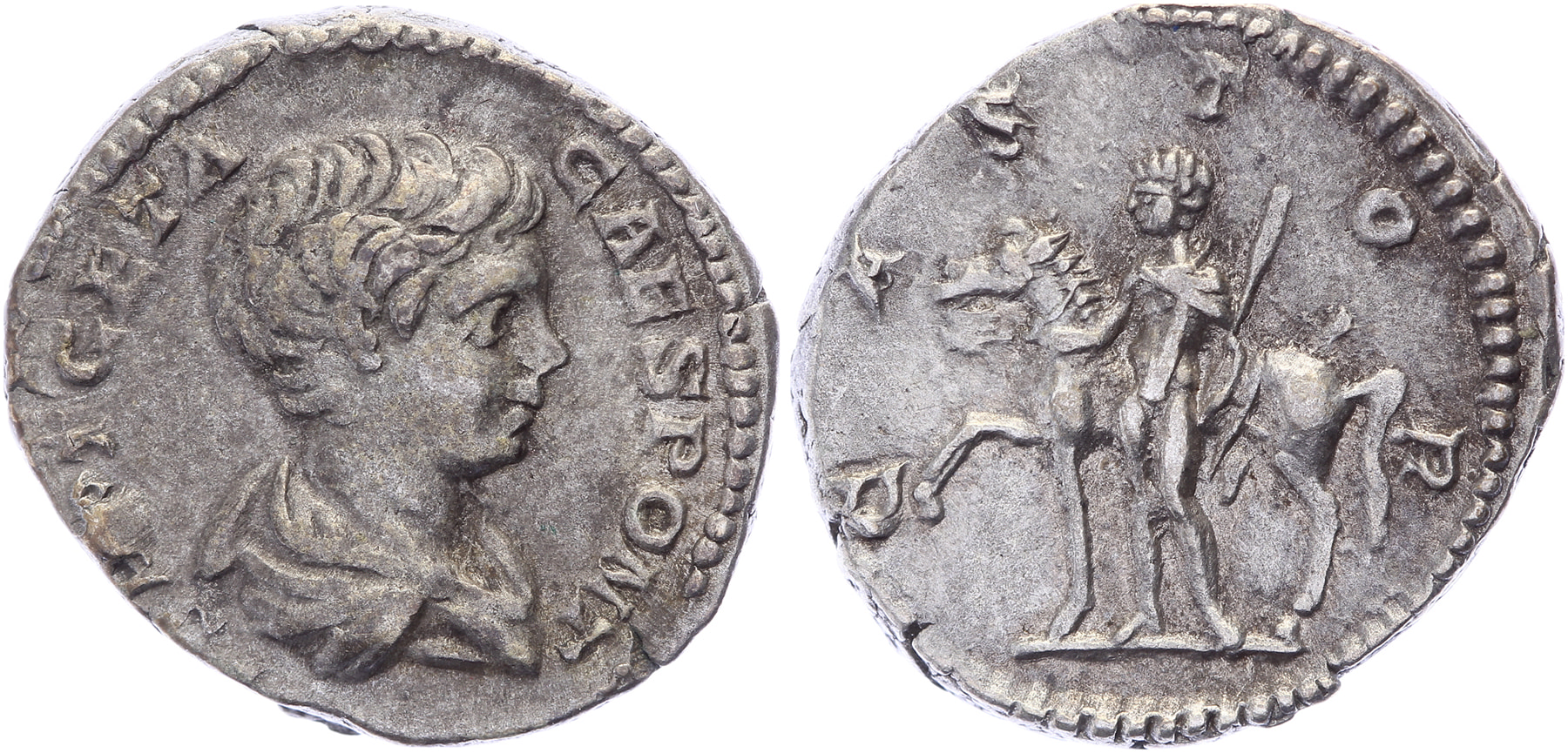 AR Denarius [3,45 gm, 18,30 mm]. Rome mint. Struck 199-204 AD. P SEPT GETA CAES PONT, bare-headed and draped bust to right, seen from behind / CASTOR, Castor standing half-left, holding sceptre, beside horse left. RIC 6; BMCRE 216. Scarce. Toned gVF.