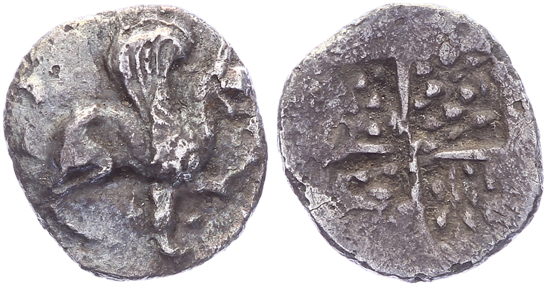 Circa 544-494 BC. AR Hemiobol [0,27 gm, 8,5 mm]. Griffin seated right, raised forepaw / Quadripartite incuse square with granulated quarters. SNG Copenhagen 1441. Toned VF.Purchased from Tom Vossen, December 2002